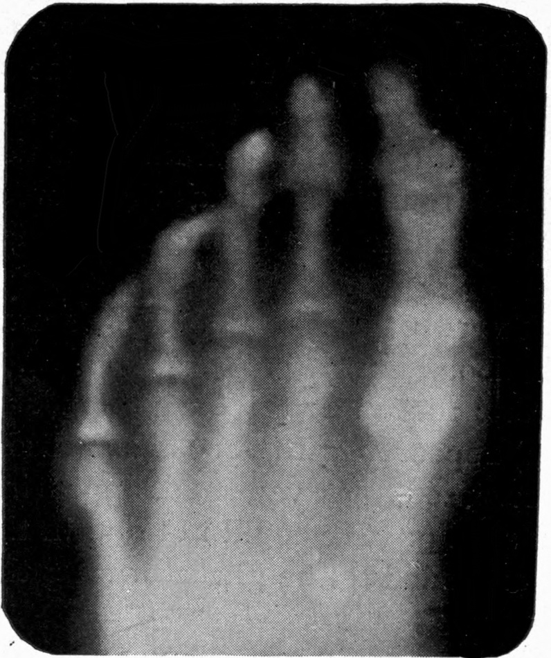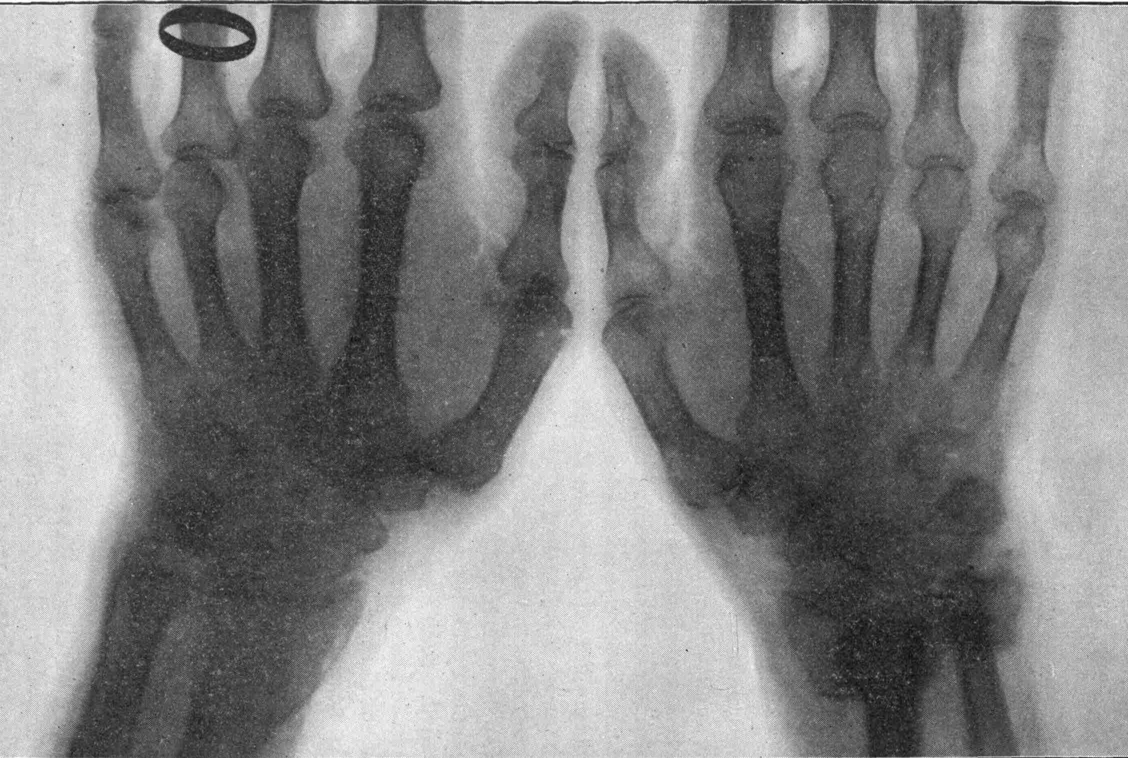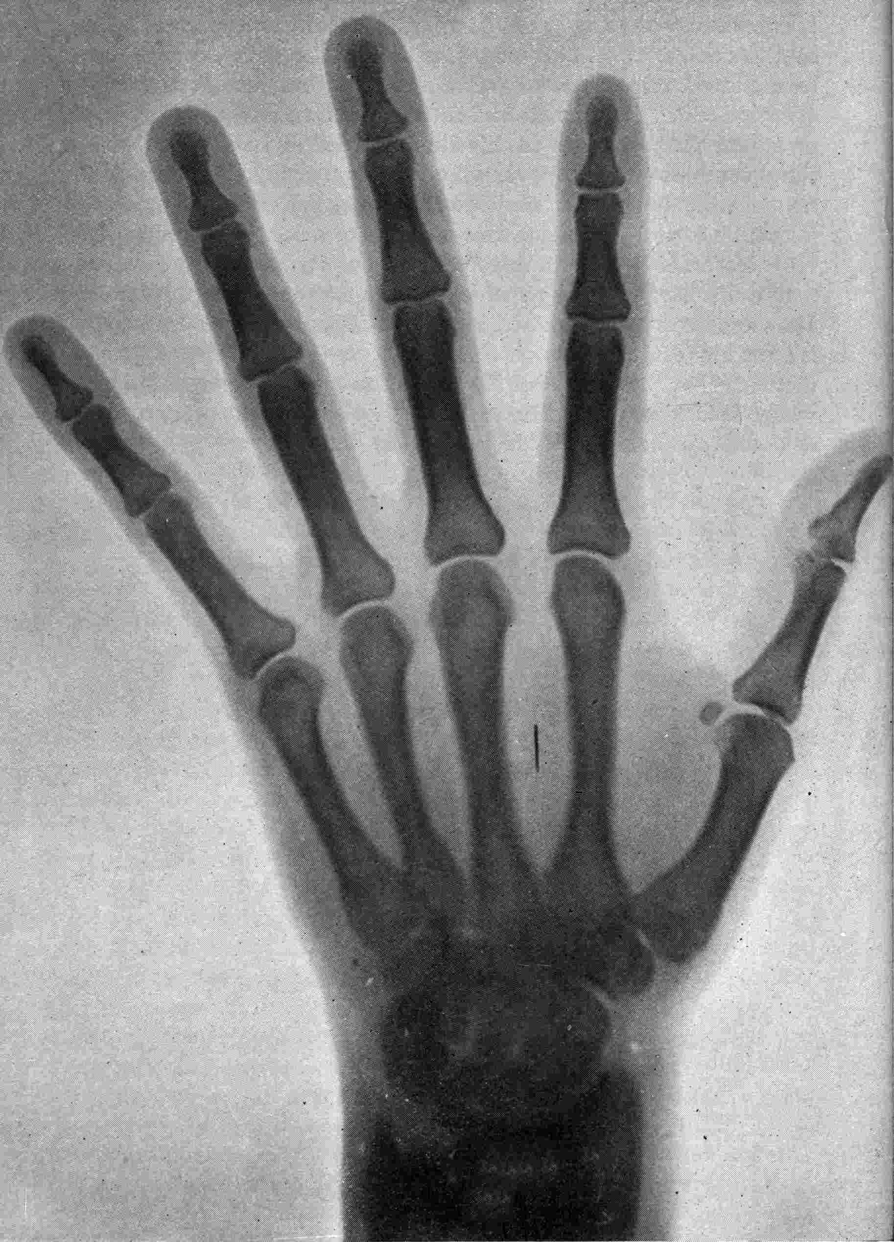 210. A book could be filled with the numerous cases of diagnosis by X-rays showing the utility. In closing this chapter, let it suffice to mention some of the sources of literature relating to this subject directly or indirectly: location of shot (by Dr. Ashhurst, Phila.) in lady’s wrist, not located by other means. Dr. Packard’s case of acromegaly; Dr. Muller’s (Germantown) location of needle in boy’s foot; cause of pain not before known; needle subsequently removed; a perfect thorax, or trunk, by Prof. Arthur W. Goodspeed, University of Pennsylvania; Thomas G. Morton’s (M. D. Pres. Acad. Surg., Phila.) application to painful affection of the foot, called metatarsaligia. All of the above noticed in Inter. Med. Mag., June, 1896. Case of a burned hand with anchylosis of the fingers, by W. W. Keen, M.D., L.L.D. Bacteria not killed by X-rays. Normal and abnormal phalanx distinguished. Fracture and dislocation sometimes differentiated by X-rays. Amer. Jour. Med. Sci., Mar., ’96.