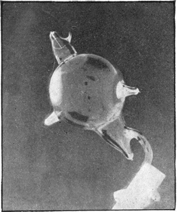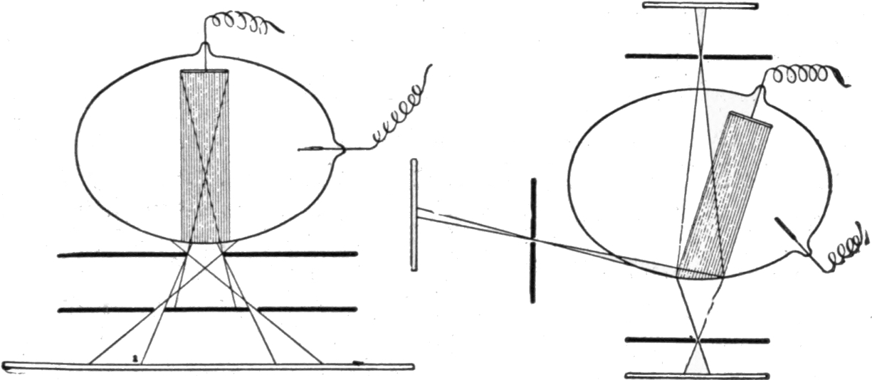 Prof. Sylvanus P. Thompson (The Electr., Lon., June 26, ’96) located a wire in a focus tube in the path of the rays between the platinum reflector and the wall of the tube. Not only was there a sciagraph of this wire produced in the sciascope, but also the Crookesian shadow of the wire on the wall of the bulb. For this experiment the exhaustion must be quite high. “At no state of exhaustion did the platinum reflector convert all the internal cathode rays into X-rays.” Both shadows were cast by the platinum reflector as the origin. More or less of the rays between the reflector and the glass were sensitive to a magnet.