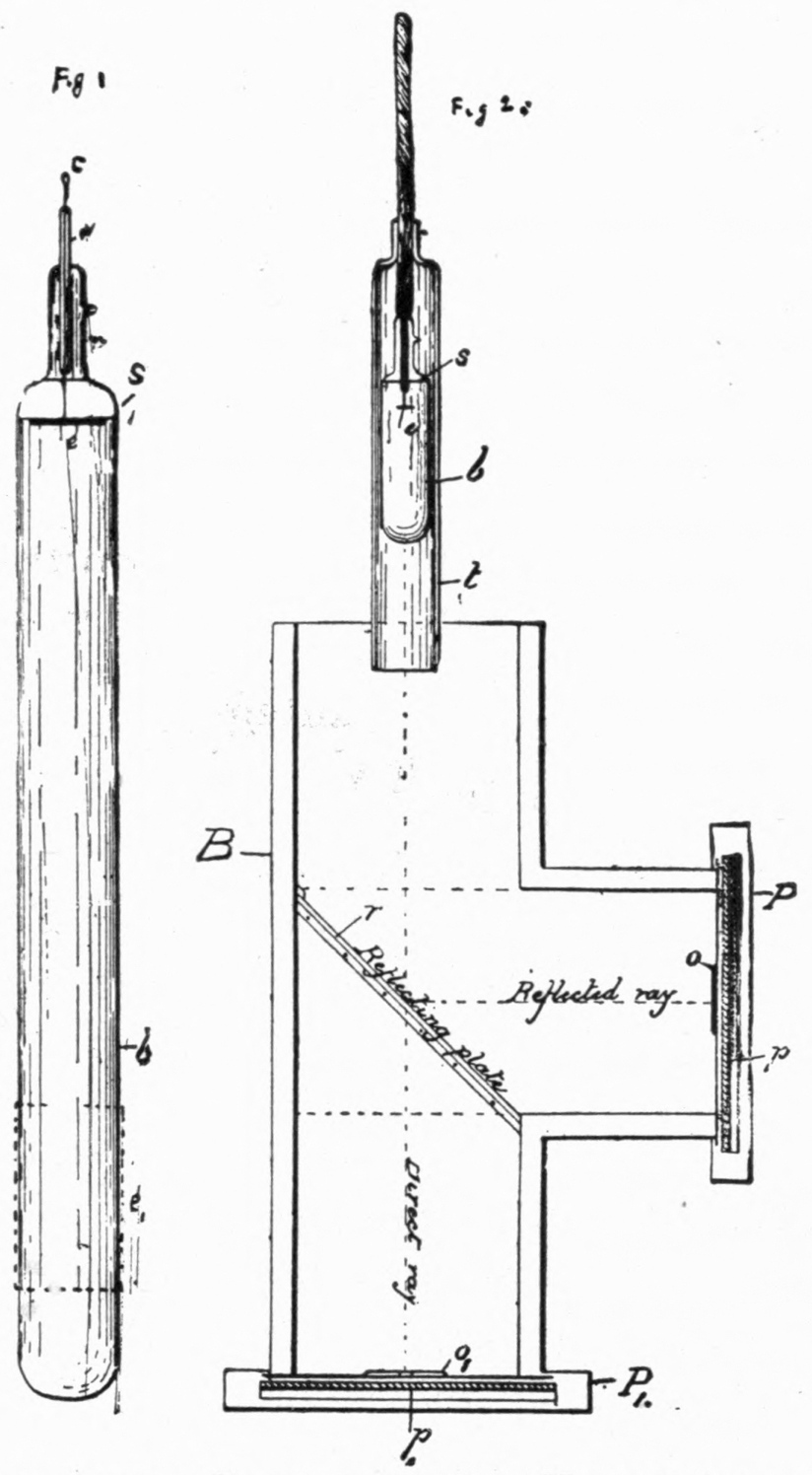 “Very near the Crookes tube there is a screen “E” (diagram omitted), of brass, perforated by a slit, the width of which has rarely reached a half mm. A second metal screen, E´, is formed of a plate provided with two slits or pierced with a window in which is fixed a metal rod of 1 mm. in diameter. This screen is placed at the distance, a, behind the former. Lastly, a photographic plate, enfolded in two leaves of black paper, is placed at the distance, b, behind the second screen, E´.”