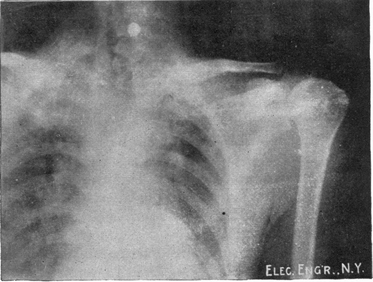 206. The author saw one of Dr. Morton’s original photographed sciagraphs of the thorax, 15 inches by 11 inches, not at all creditably reproduced at page 161. In the original, to the surgeon’s eye: “The acromion and coracoid processes of the shoulder blade are clearly shown in their relations to the head of the humerus, or arm bone, and also the end of the clavicle, or collar bone, is shown in its relations to the shoulder joint. We have, in short, an inner inspection in a living person of this rather complicated joint, the shoulder, and there can be no doubt that in defined pictures of this nature even very slight deformities and diseases would be detected. It is noticeable that the front portions of the ribs are not shown, only the posterior portions lying nearest to the sensitized plate appear; also the breastbone was sufficiently dense to almost entirely obstruct the X-rays. A collar button at the back of the neck is taken through the backbone. In some of my negatives the dark outline of the heart and liver is shown as well as the outlines of tumors in the brain; but this is evidently for purposes of demonstrating the location of organs, an over-exposure, and does not, therefore, indicate the outlines of the heart.”