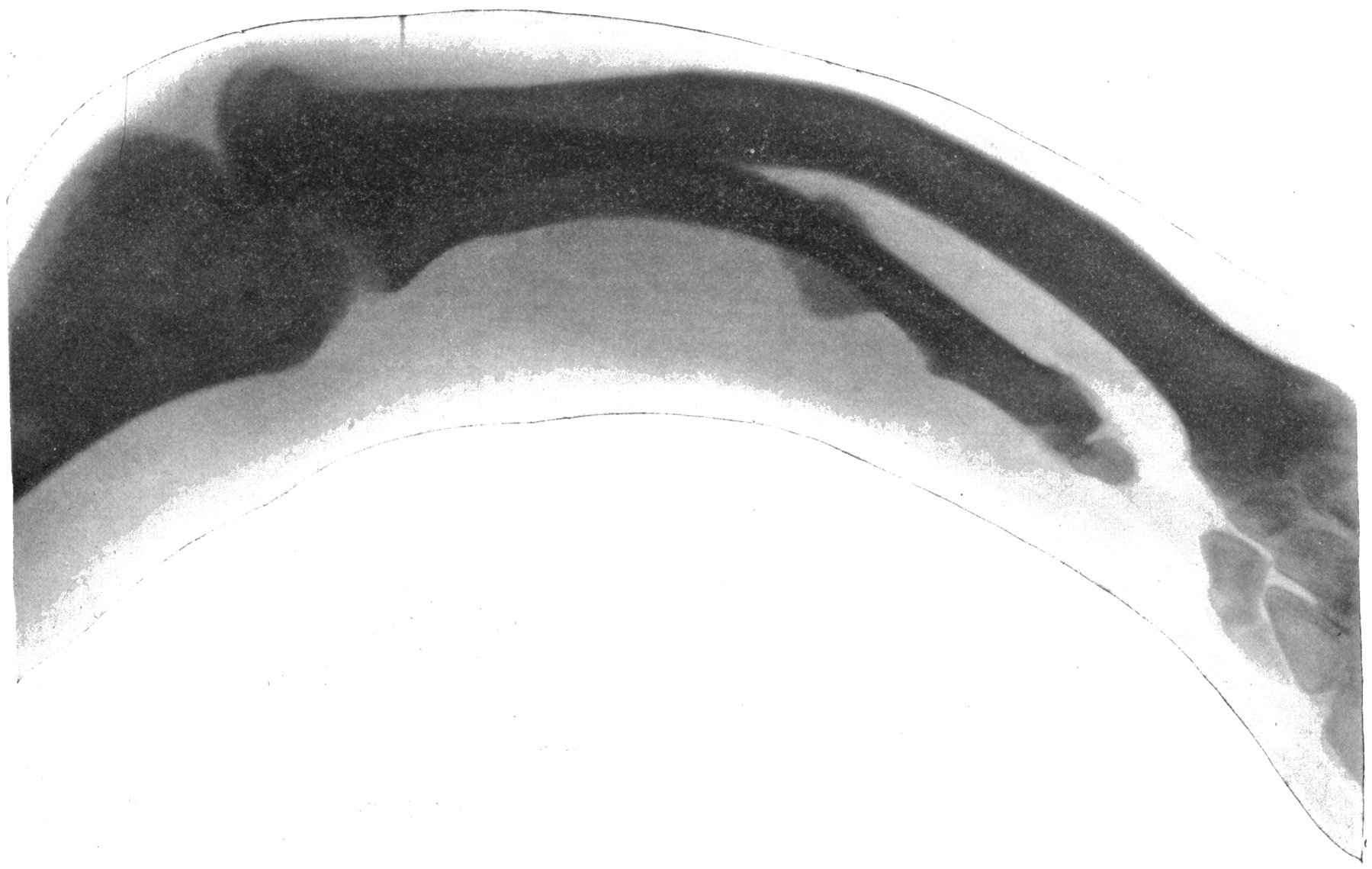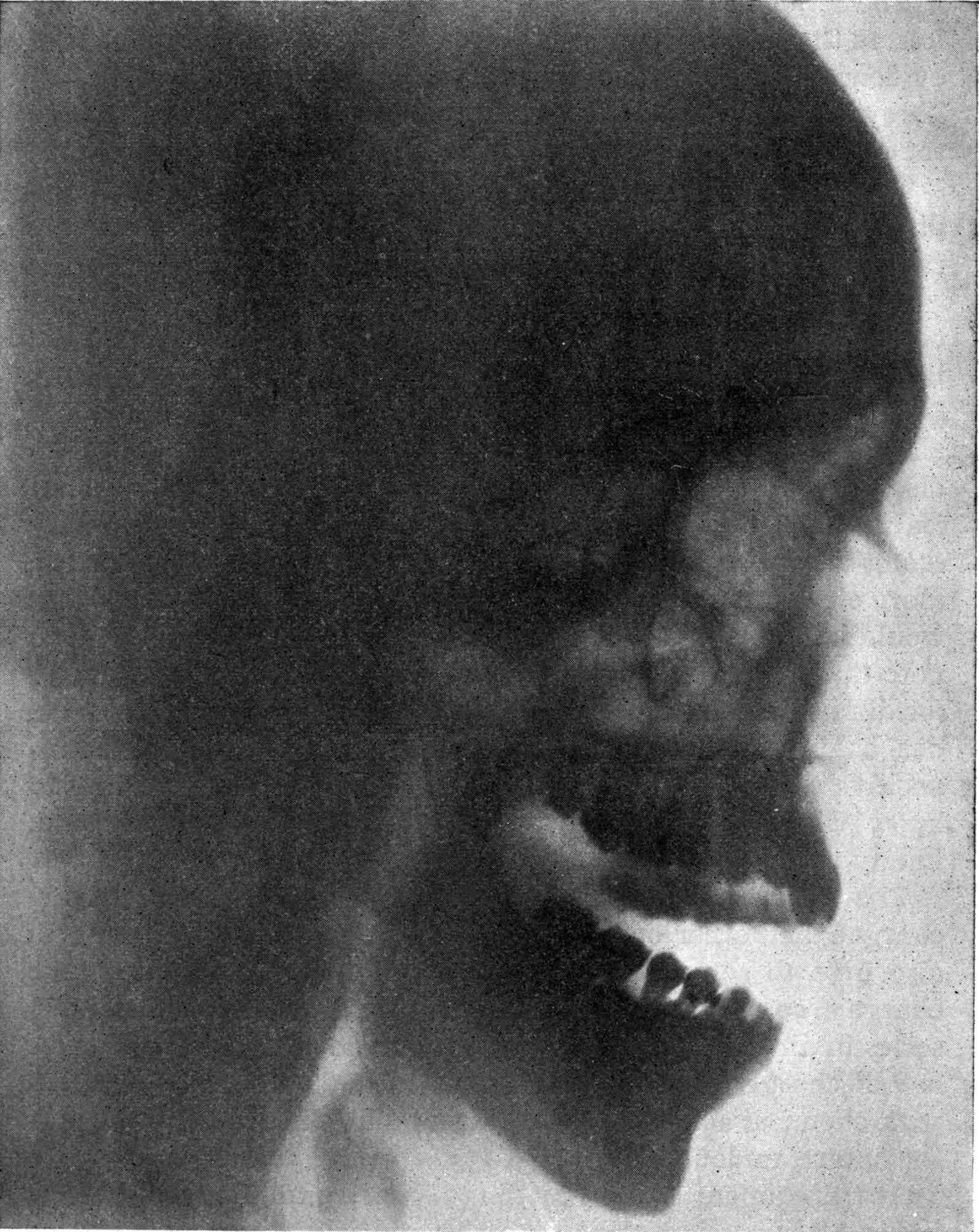 In regard to application in dentistry, he stated:—“Each errant fang is distinctly placed, however deeply imbedded 176within its alveolar socket; teeth before their eruption stand forth in plain view; an unsuspected exostosis is revealed; a pocket of necrosis, of suppuration, or of tuberculosis is revealed in its exact outlines; the extent and area and location of metallic fillings are sharply delineated, whether above or below the alveolar line. Most interesting is the fact that the pulp-chamber is beautifully outlined, and that erosions and enlargements may be readily detected.”