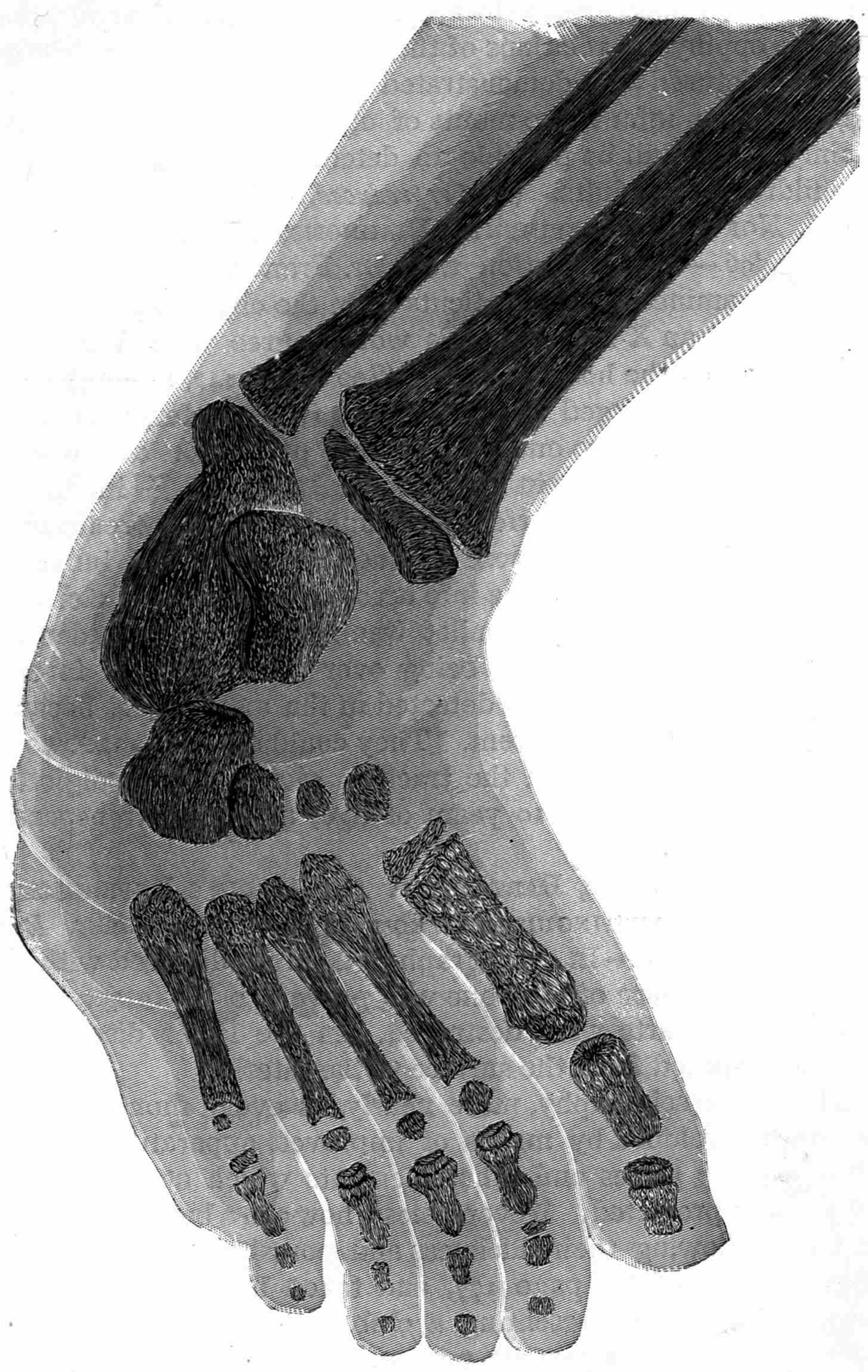 From sciagraph of club foot of child by Prof. Goodspeed. Copyright, ’96, by William Beverley Harison, Pub. of X-ray pictures, New York. This linograph (woodcut), engraved and donated by Stephen J. Cox, Downing Building, 108 Fulton St., New York, affords an exact likeness of the sciagraph,—well-nigh impossible by an untouched half-tone.