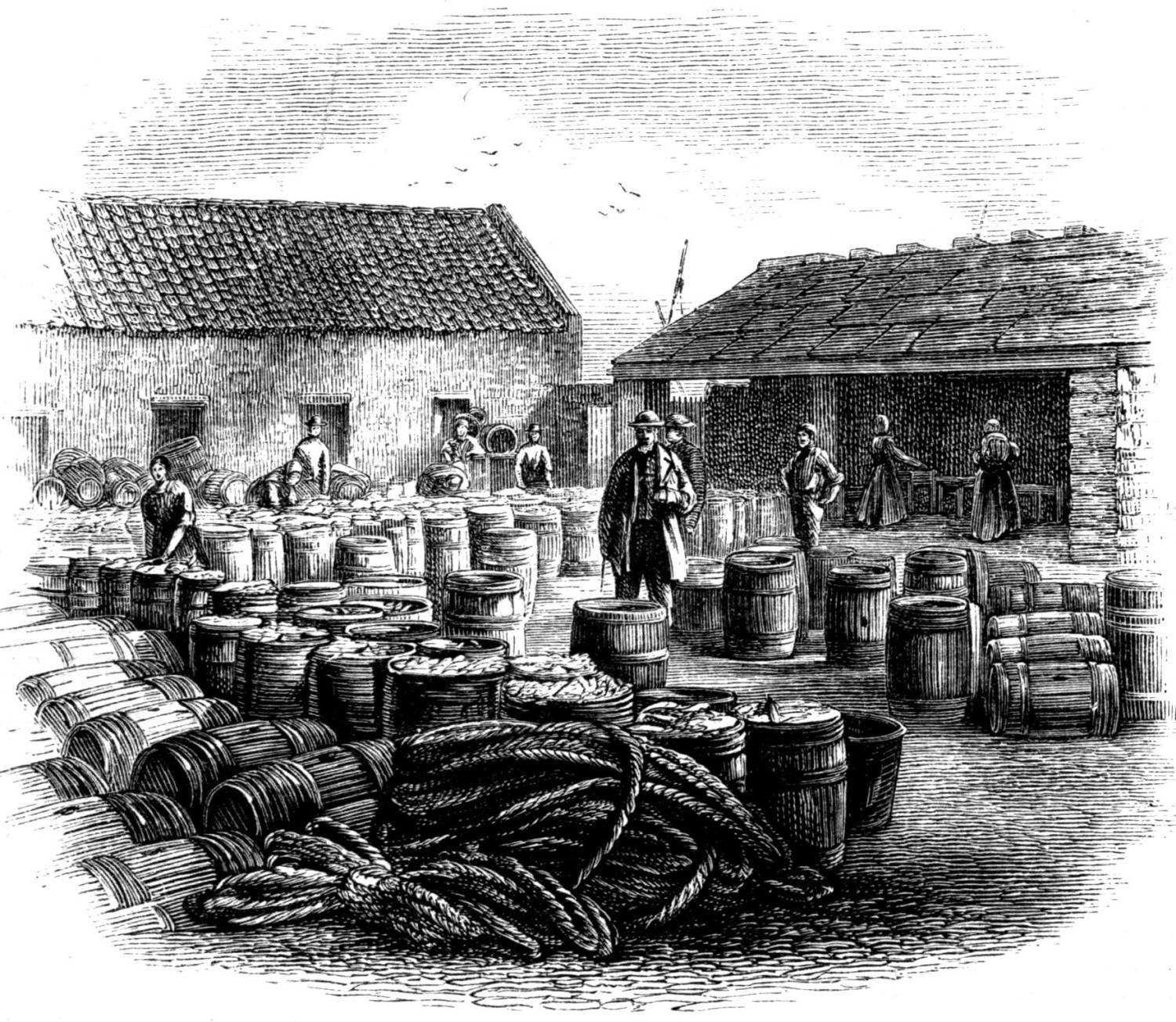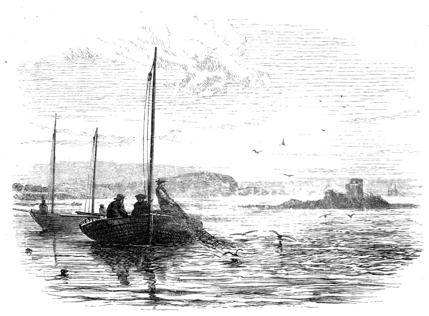 “Each yawl, varying in tonnage from 28 to 45 tons, costs from £600 to £650, and is divided into shares; of its earnings 3s. 6d. in the pound are paid to the owner or owners, 10s. are devoted to the current expenses, and the remainder is divided among the men who find the bait. When a new boat is required, several persons—gentlemen speculators, harbour-masters, etc., and boatmen—take certain shares of it, which vary in amount from a half-quarter to a half of the cost; application is then made to a builder, sail-maker, anchor-maker, and other tradesmen; and the vessel, in due time, is paid for, equipped, and given over to the owners. Each lugger-yawl carries two masts, and is provided with three sets of sails to suit various states of weather. The foresail contains 200 or 250 yards, the mizen 100, and the mizen-topsail 40 yards; the lesser sizes being severally of 100, 60, and 50 yards. The jib is very small. On the average the yawl is of 40 tons, and measures 51 feet keel, or 55 feet over all, and is of 17 or 18 feet beam; drawing 6½ feet water aft, and 5 feet forward. The amount of ballast varies from 20 to 30 tons. The yawl is provided with 120 nets, each of which costs £30. Half of this number are left on shore, and changed at the end of every 12 weeks. The crew is composed of 7 men and 2 boys. For instance, the ‘Wear,’ commanded by Colling, a first-rate seaman, carries two others, like himself part-owners, 4 men receiving, besides their food, £1, and 1 boy at 18s., and another at 11s. a week; each fisherman, who is a net-owner, receives 24s. a week. The expenses in wages and wear and tear are calculated at from £12 to £15 weekly. The herrings are valued at £2 per 1000 on an average. Sometimes 23,000 fish are caught in a single haul, occasionally as many as 60,000, but 40,000 are considered a good catch. To remunerate the crew, £50 or £60 a week ought to be obtained. Each net is 10 fathoms long, and is sunk 9 fathoms during the fishing, the upper part being floated by a long series of barrels, which are fitted at intervals of 15 fathoms. The warps used for laying out the nets in each vessel measure 2200 yards. Two men take up the nets, two empty the fish out of them, and one boy stows the nets while his fellow stows the warps, which are raised by a windlass worked by the men. Each net weighs about 28 pounds. In order to preserve the nets and sails, it is necessary at frequent intervals to cover them with tanning, which is prepared in large coppers. These coppers cost £40.”