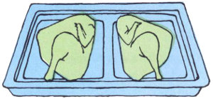 | Chicken (halved) | 2-3 | In Broiler—low | 1-1¼ | hours | |