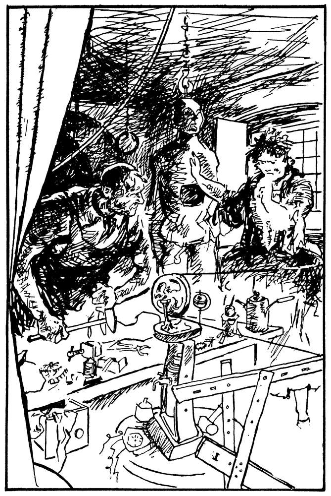 „Es scheint,“ sagte sein Herr, „als rauche man hier nicht. Wahrscheinlich, um die Luft reiner zu erhalten, denn natürlich ist es keine Kleinigkeit, in diesen unterirdischen Städten gute Luft zu schaffen. Sieh, das Ding, das da oben in der großen Deckenöffnung schnurrt, ist sicher ein Ventilator. Der Schacht, durch den wir hinabstiegen in diese Unterwelt, scheint ein Luftkanal gewesen zu sein.“