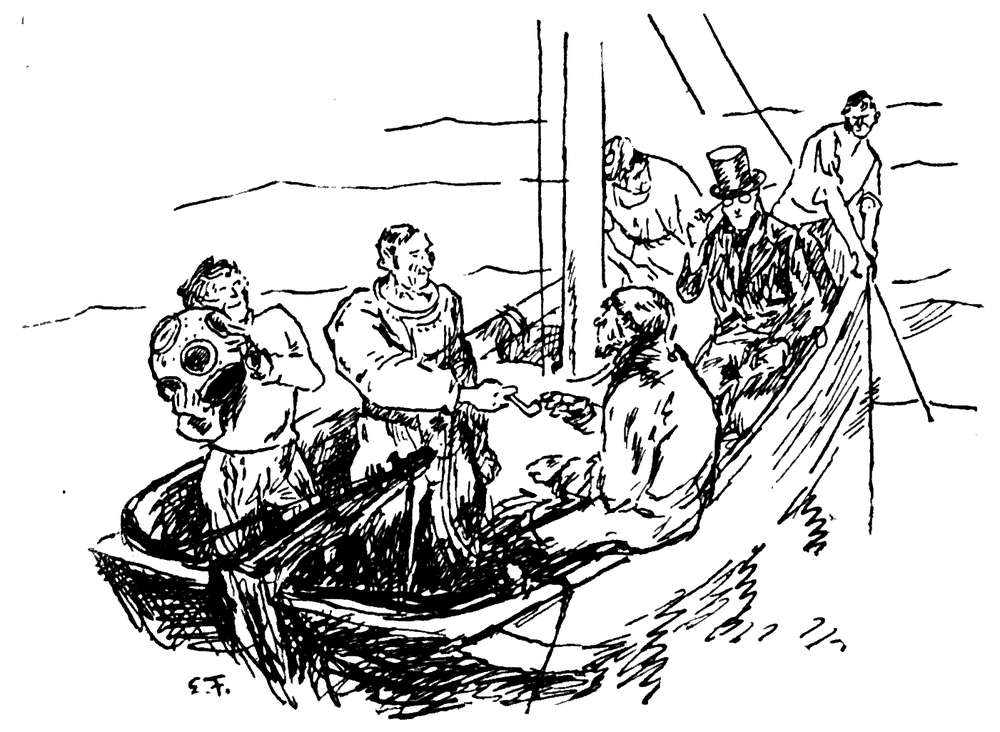 „Das heiße Wasser scheint in dieser Welt eine große Rolle zu spielen,“ sagte der Professor und nahm eine Prise. „Hätte ich nur meine Tabakspfeife bei mir,“ klagte der alte Diener, „dann wollte ich mit Herrn Professors Erlaubnis ein paar Züge tun, denn das Rauchen ist nun mal meine Leidenschaft.“