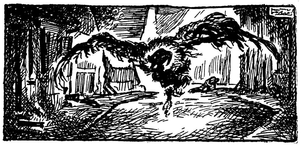 Auf einmal rauschte und brauste es in der Höhe, und eine Posaunenstimme rief nieder aus den Wolken. Die beiden Uranier bekamen einen Todesschreck. Ihre Augen rollten wie Kegelkugeln, und ihre Rüssel schnoberten entsetzt in der Luft herum. Dann aber liefen sie schleunigst zum Schacht und verschwanden in der Tiefe.