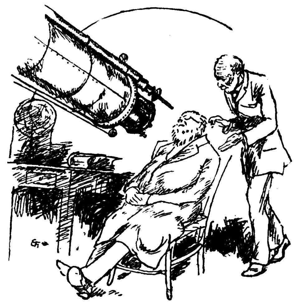 „Genau so wie der Herr Professor! Ich wurde eines Tages da geboren, ohne meine Einwilligung! Aber Herr Professor machen mich ganz ängstlich! Herr Professor sind doch nicht krank und fiebern? Ich lag drinnen auf meinem Ruhebett, auf einmal höre ich Herrn Professor laut schreien. Ich eile herbei, da finde ich Herrn Professor am Fernrohr im Stuhl eingeschlafen. Es ist ja schon gegen Morgen, und die Sonne muß bald aufgehen. Herr Professor scheinen lebhaft geträumt zu haben.“