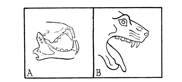 Fig. 2. A, Jaw bones of lion; B, head of lioness from Caere vase (Fig. 1), after Morin. Note the careful way in which the artist has distinguished the molar from the cutting teeth.