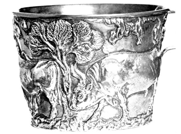 The Greek people had many roots, racial, cultural, and spiritual, and from them all they inherited various powers and qualities and derived various ideas and traditions. The most suggestive source for our purpose is that of the Minoan race whom they dispossessed and whose lands they occupied. That highly gifted people exhibited in all stages of its development a marvellous power of graphically representing animal forms, of which the famous Cretan friezes, Vaphio cups (Fig. 5), [Pg 6] and Mycenean lions provide well-known examples. It is difficult not to believe that the Minoan element, entering into the mosaic of peoples that we call the Greeks, was in part at least responsible for the like graphic power developed in the Hellenic world, though little contact has yet been demonstrated between Minoan and archaic Greek Art.