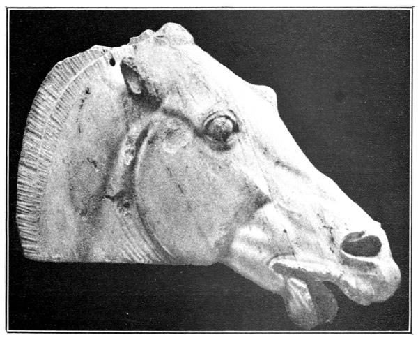 Animal paintings of this order are found scattered over the Greek world with special centres or schools in such places as Cyprus, Boeotia, or Chalcis. The very name for a painter in Greek, zoographos, recalls the attention paid to living forms. By the fifth century, in representing them as in other departments of Art, the supremacy of Attica had asserted itself, and there are many beautiful Attic vase-paintings of animals to place by the side of the magnificent horses’ heads of the Parthenon (Fig. 6). In Attica, too, was early developed a characteristic and closely accurate type of representation of marine forms, and this attained a wider vogue in Southern Italy in the fourth century. From the latter period a number of dishes and vases have come down to us bearing a large variety of fish forms, portrayed with an exactness that is interesting in view of the attention to marine creatures in the surviving literature of Aristotelian origin (Fig. 3). [Pg 9]