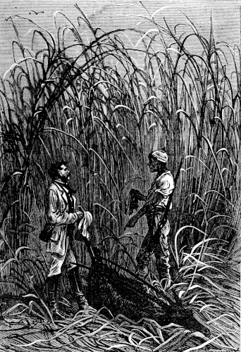 The young astronomer seated himself against a giant euphorbia, forty feet high, and in that position looked down the river, while the hunter, little used to sitting, continued to walk along the bank, and Top roused up clouds of wild birds, to which, however, his master gave no heed. They had been here about half an hour, when William Emery noticed that Mokoum, who was standing about 100 feet below him, gave signs of a closer attention. Was it likely that he had seen the long-expected boat? The astronomer, leaving his mossy couch, started for the spot where the hunter stood, and came up to him in a very few moments.