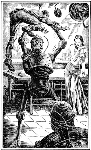 His delicate, deep pocketed eyes looked beseechingly into mine, once. Then the tremendous pressure bulged them horribly and unconsciously at me. His bony arms flapped and waved spasmodically and blood spurted from his small almost invisible ears and equally minute nose. Then his whole frail body seemed to crack through the middle and deflate. At another telepathic command from Jokan, the robot's arms raised and unbent, and the body of Draken thudded on the inlaid floor.