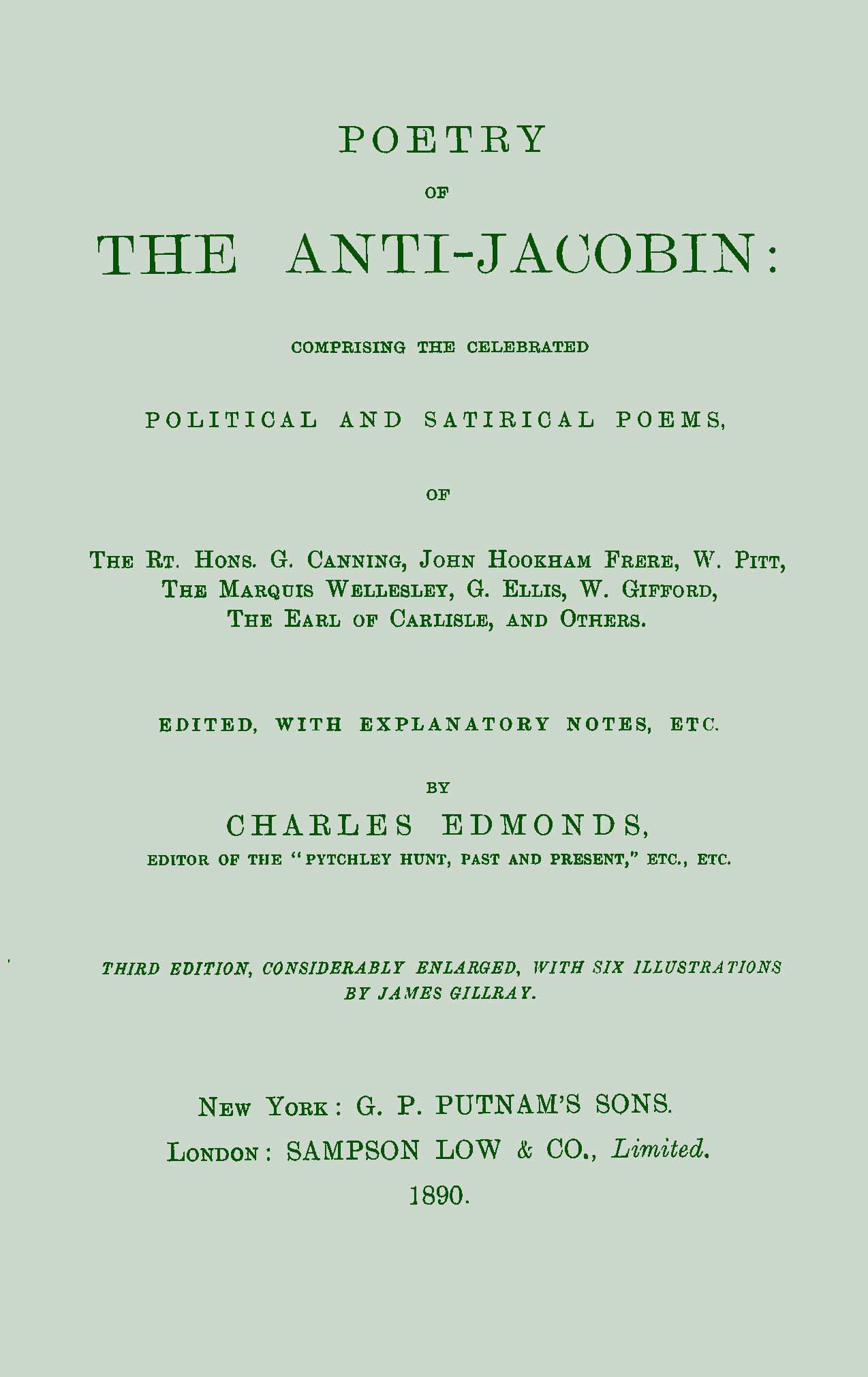 This volume includes the whole of the Poetry contained in the original Anti-Jacobin, with a few verbal corrections. Previous to its publication, it was announced that it would be illustrated by 40 plates expressly designed by Gillray; but they never appeared. Numerous editions in 12mo subsequently appeared, but without any additions, till those mentioned below.