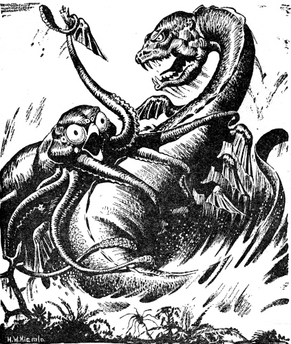 He acted as lightning strikes, instinctively. Later he would know why. In his world thought had to follow action. His huge jaws closed on a number of the thick tentacles, severed them. They whipped free of the girl, jerking and contorting, slashing the murky vapor in aimless death patterns. The girl somehow had staggered out of reach of the remaining ones.