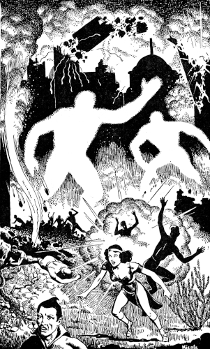 "Some of you knew Dead-Eye and his Elizabeth. He's gone now, but he destroyed three of the shadow-things with leaden pellets from his old sixshooter before he died. He showed me the way to lick those shadows. Simply, it's this. A concentration of powder can open a hole in the atomic shield of the shadows. But in our atomic weapons we have a flow of power and it's sucked away by the shield before it can concentrate.