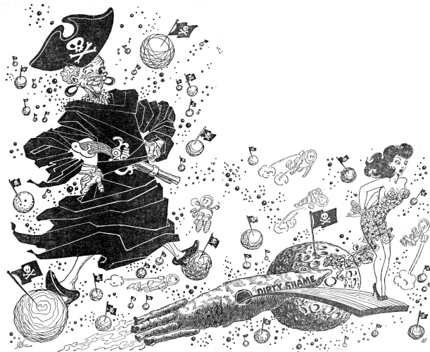 "I must say that I think Miss Toujours has the prettiest mouth I've ever seen," boomed Captain Fogarty, his voice sounding something like a cross between a foghorn and a steam whistle. And he was not merely being gallant, for many a lonely night as he flew the darkness between Earth and the many planets, he had dreamed of caressing those lips.
