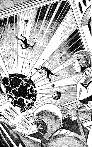 What happened next, they never knew exactly. On the dark surface of the planetoid a blazing bubble of white incandescence appeared, expanding within split seconds to all but obscure the whole bulk of the disk. It churned and whirled and flashed, mushrooming out in a hellish coruscation of destruction. The blaze of light outlined the two men and the ship and the planetoids within a fifty mile circle and the expanding shock wave fanned out. It struck the two space armored men to send them spinning wildly. The glowing bulk of the monitor reeled and bucked. Strike felt himself whipping up and down at the end of the cable that bound him to Cob Whitley. He felt himself being buffeted and burned by the dazzling flare of atomic fire. The merciful blackness spread itself like a curtain over his tortured eyes....