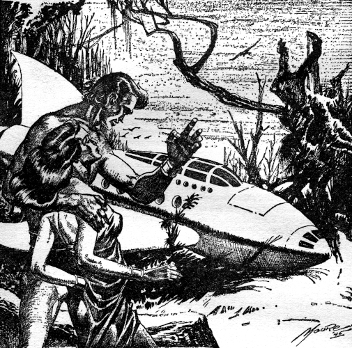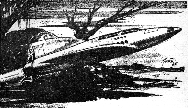 They found food. They walked through the ship. It was empty. Only in the control room did they find the remains of a man who must have been the chief pilot. The others had evidently bailed out into space in emergency lifeboats. This pilot, sitting at his controls, alone, had landed the ship on a mountain within sight of other fallen and smashed crafts. Its location on high ground had saved it from the floods. The pilot himself had died, probably of heart failure, soon after landing. The ship had remained here, almost within reach of the other survivors, perfect as an egg, but silent, for—how many thousand days? If the pilot had lived, what a different thing life might have been for the ancestors of Sim and Lyte. Sim, thinking of this—felt the distant, ominous vibration of war. How had the war between worlds come out? Who had won? Or had both planets lost and never bothered trying to pick up survivors? Who had been right? Who was the enemy? Were Sim's people of the guilty or innocent side? They might never know.