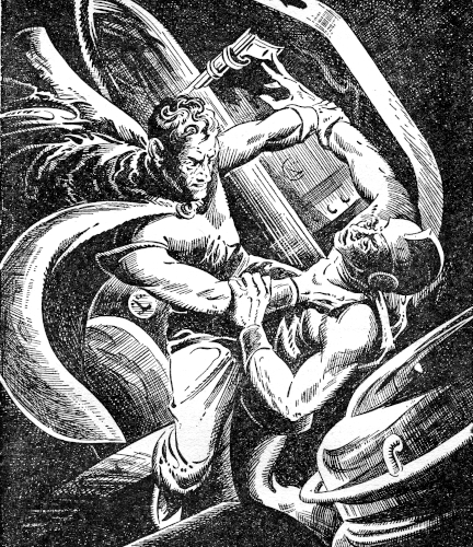 Even as Ketrik hurled himself forward, he saw madness on Vaajo's face. More of the rays blanked off as Vaajo swept his hand down. Then Ketrik was upon him. The two metal-suited figures clashed, went spinning backward and then to the floor of the balcony in a wild tangle.