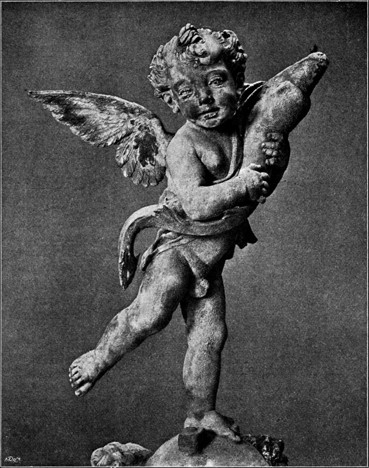 Die Arbeiten in gebranntem Thon, die von der Hand des Agnolo di Polo überall in Florenz zu sehen waren, können wir, vielleicht der Unbeständigkeit ihres Materials wegen, nicht mehr nachweisen. Einigen Ersatz indessen, um Verrocchios Nachwirkung auf diesem für Florenz ganz eigentümlichen Gebiet plastischer Kunst zu beobachten, bietet eine bestimmte Gruppe von Robbia-Arbeiten. Madonnen in bauschigem Gewand und Mantel, das Christkind auf einem Kissen neben sich, umflogen von den Engeln des Forteguerri-Grabes, Wiederholungen ganzer Kompositionen Verrocchios, der Taufe Christi, der Enthauptung des Johannes, des Thomas-Wunders, Putten, die denen des Verrocchio blutsverwandt sind, werden in dieser Kategorie angetroffen. Kunstgeschichtlich führen sie in das Atelier des letzten der drei Robbia-Meister, Giovannis, und sprechen eher für die Beliebtheit der benutzten Originale als daß sie die Erfindungsarmut des Nachahmers bloßstellten. Mit diesen Arbeiten aus zweiter und dritter Hand ist Verrocchios Kunst volkstümlich geworden. Man begegnet ihnen in der Provinz häufiger als in Florenz selbst. Es ist, als hätte die „blühende Stadt“ von ihrem Über[S. 100]flusse hergegeben, damit auch die bescheidenste Dorfkirche zwischen den Weingärten der Arnoebene, das entlegenste Kloster auf dem Kamm des Gebirges Teil habe an dem herrlichen Wachstum in ihren Mauern.