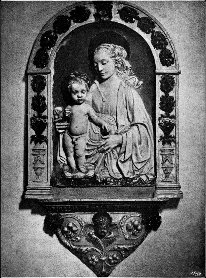Maria, bis zu den Knieen sichtbar, sitzt in felsiger Landschaft mit dem Kinde auf dem Schoß, das die Ärmchen der Mutter entgegenstreckt. Dies Motiv ist schon von den plastischen Madonnen des Meisters her bekannt; nur ist das Kind hier auf dem Schoße der Mutter sitzend und unruhiger bewegt dargestellt. Im Kopf der Madonna finden wir alle Merkmale verrocchiesker Formengebung, auch das anmutig sich von den feinen Mundwinkeln her verbreitende Lächeln wird nicht vermißt. Das Christkind in seiner drallen Fülle ist dem Fischmännchen stammverwandt. Mit dem Reichtum seiner Überschneidungen und der Kühnheit seiner Verkürzungen legt dieser Kinderkörper von einer ebenso kundigen wie sorgfältigen Meisterhand Zeugnis ab.