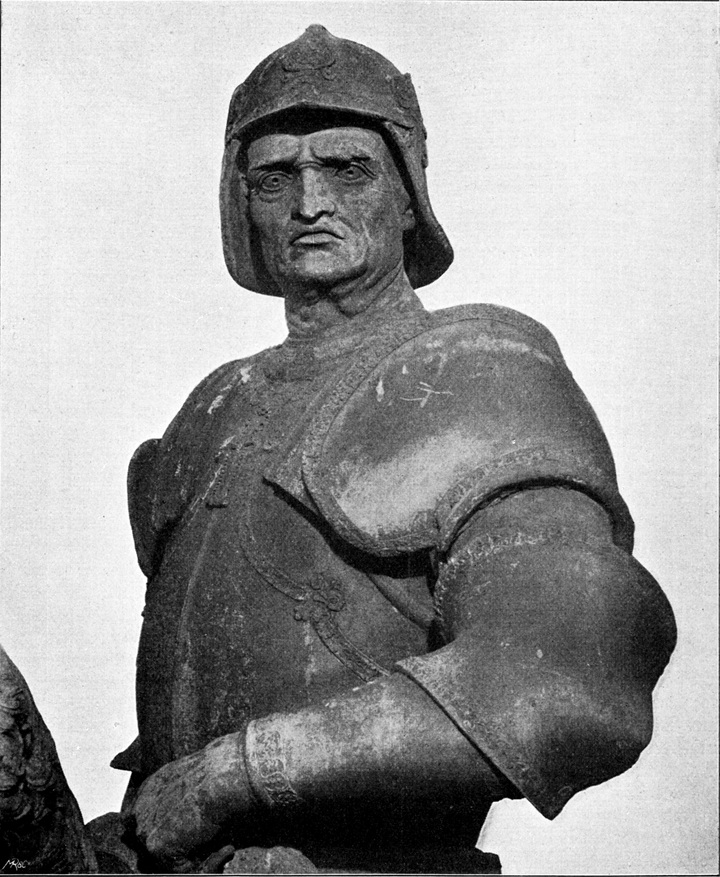 Mit der wie in einer Aufwallung kühnen Trotzes herausgedrehten linken Schulter, der der Kopf folgt, macht der Reiter die Bewegung des Rosses mit. Klar und frei überschneidet der Reiterkopf die Scheitelhöhe des Pferdes und dominiert ungezwungen über dem Ganzen. Eine Sturmhaube deckt das gewaltige Haupt mit den drohenden Augen. Die Entschiedenheit der Bewegung und die Macht des Blickes stehen schon auf der Höhe des neuen Stiles, der Kunst des Cinquecento. Im David, der übrigens auch das Motiv der herausgekehrten Schulter zeigt, in der Büste des Giuliano finden wir die Vorstufen zu dieser rücksichtslosen Größe der Bewegung. Aber neu und überraschend ist der Typus. Haben wir es mit einem Porträt des Colleoni zu thun?