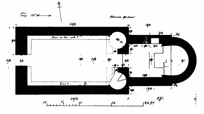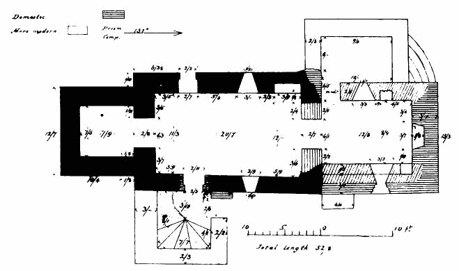 about 24 feet; length of nave 56 feet by 30 feet in width. The chancel is full of rubbish, especially at the place where the arch is usually situated; but it is not unlikely that by digging here some remains might be found sufficient to indicate the style and period of the building. From Carr’s description it appears to have been a Norman building, as he speaks of a “small Saxon arch” (the term frequently used by writers about the beginning of the century for a Norman arch) as visible in his time (p. 243).