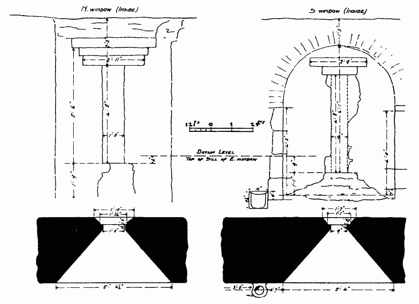 The one to the south-east, called St. Abb’s Chapel, (1) is situated in the centre of a churchyard, all the remaining tombstones of which were thrown into the sea during some law proceedings regarding the right of access by the public to St. Abb’s Head. At the time Carr wrote his History of Coldingham Priory (published 1836), the walls of the church were standing to a height of some three or four feet; now only the grass-covered foundations remain. These indicate a chancelled building, the outside dimensions of which are:—length of chancel from east to west about 21 feet, width