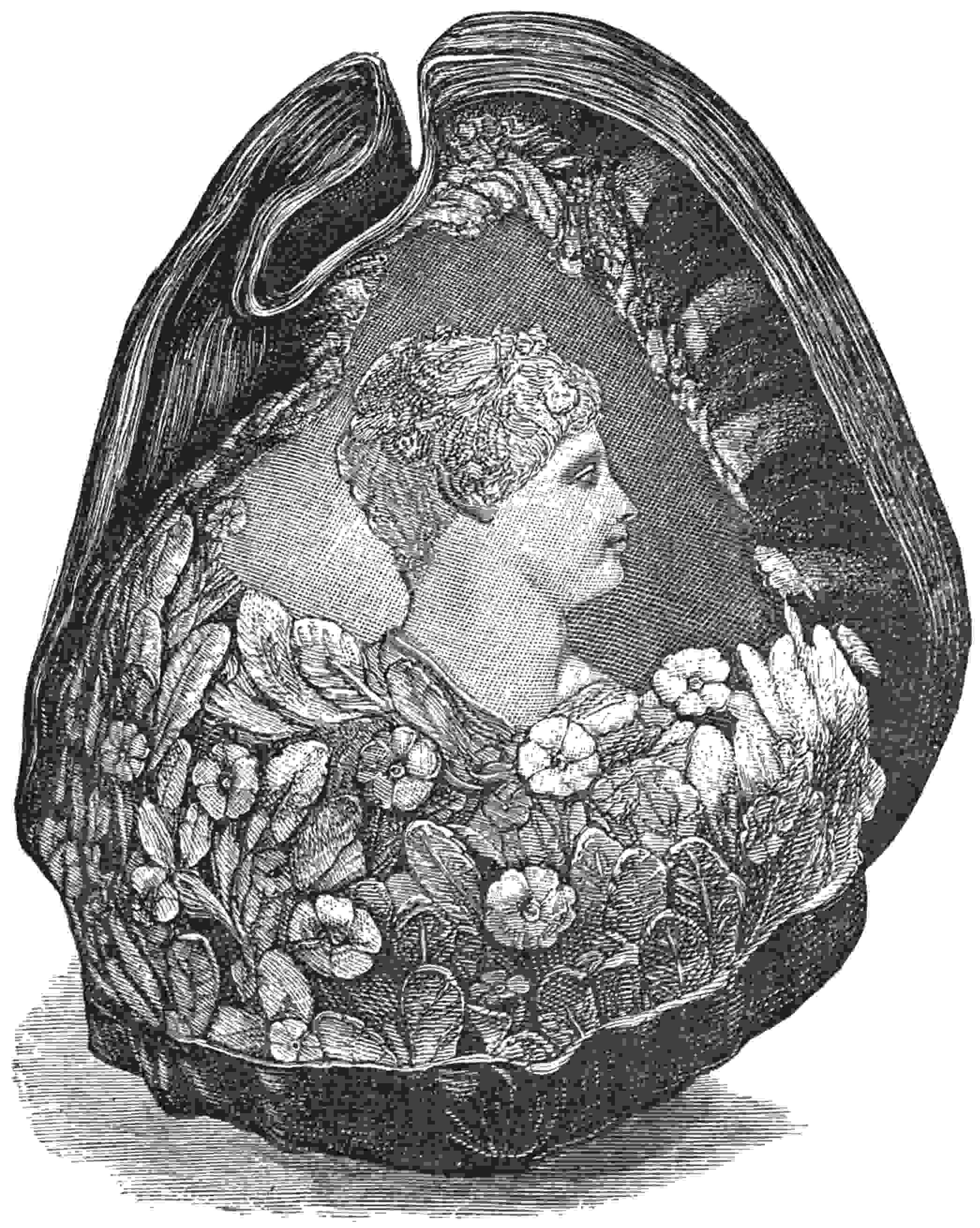 The colour of the ground in these shells varies from pink and orange to an absolute black: this is called the Black Helmet (Cassis Tuberosa), and comes from the West Indian Seas. The shell with a pink ground is called the Queen Conch (Strombus Gigas), and is also brought from the West Indies. A favourite variety is the Bull’s Mouth (Cassis Rufa), found in the East Indian13 Seas, which has a sard-like ground. Another class is the Horned Helmet (Cassis Cornuta), which is brought from Madagascar; in this the ground is dark claret in colour. Occasionally shells are made use of having three layers, the upper, always dark-coloured, serving for the hair, or a wreath, or for armour; the second layer, which is always white, is used for carving the figure; and the third layer is the ground.