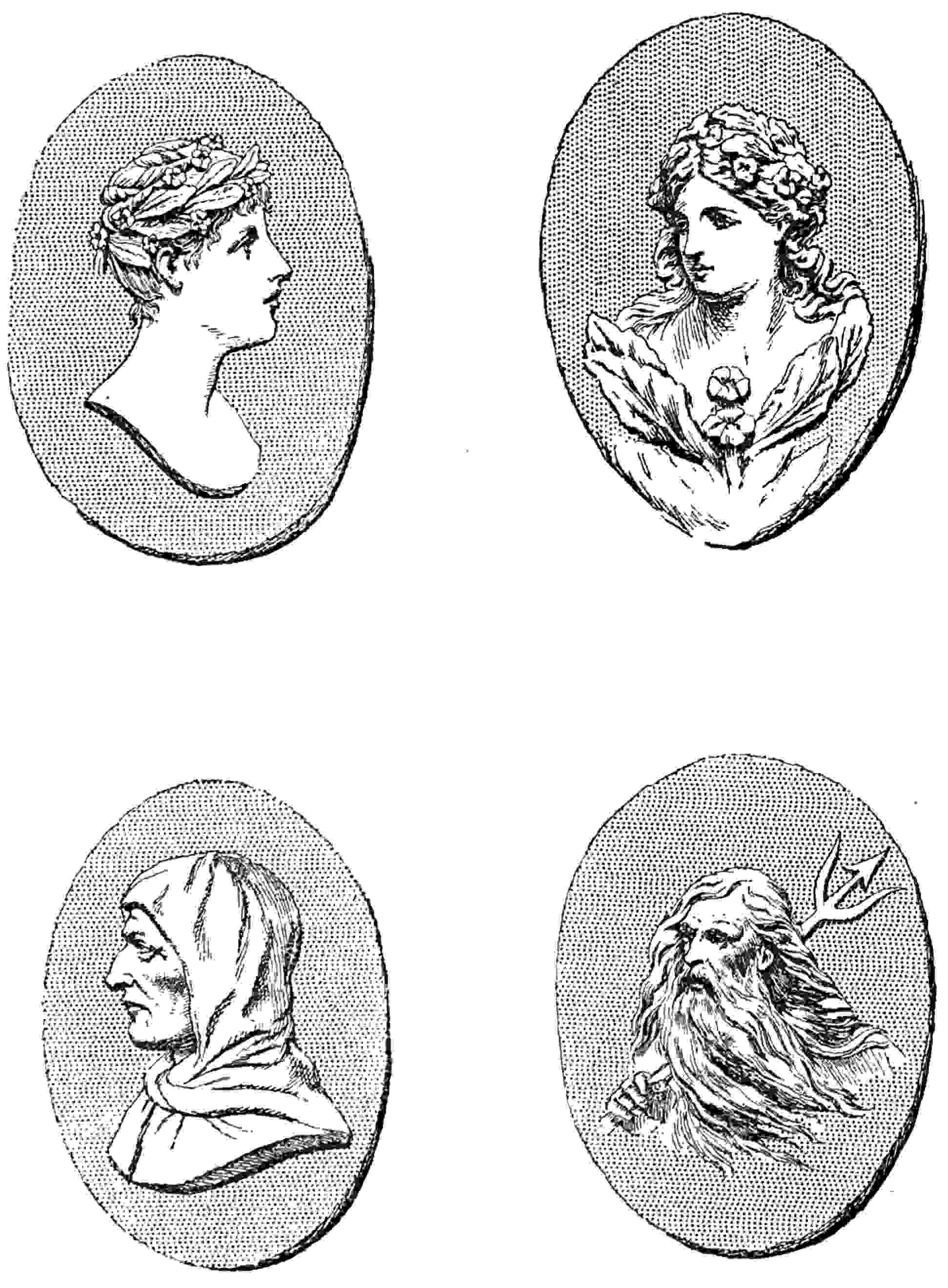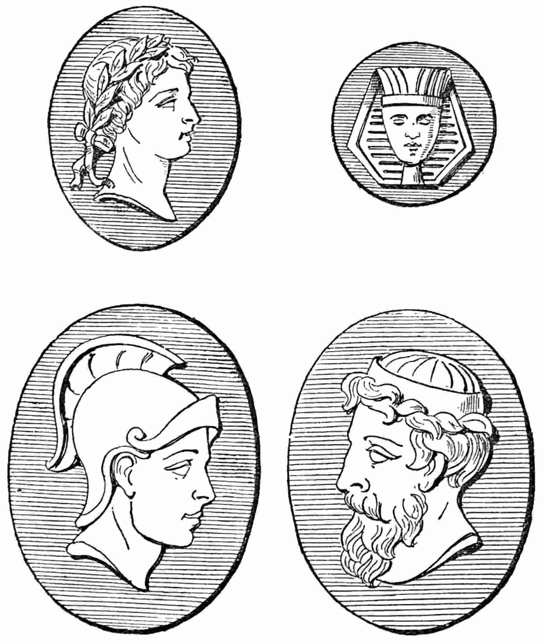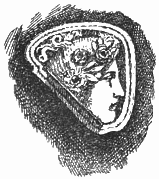 “The term Cameo, in the language of art, is usually applied to gems or stones that are worked in relievo, that is, in which the object represented is raised above the plane of the ground, in contradistinction to intaglio, in which the subject is53 engraved or indented. The art of ornamenting precious stones with heads and figures is of high antiquity, but it was for the most part confined to intaglio or indenting, an easier process than relieving the work from a ground. Such stones were used for signets or seals in very remote ages by the Etruscans and the Greeks. One of the first names of great note that occurs in this branch of art is that of Pyrgoteles, who lived in the time of Alexander the Great, and who alone was permitted to engrave seal rings for the King. Tryphon, who lived under the immediate successors of Alexander, also deserves mention here, being the author of a beautiful and well-known Cameo in the Marlborough collection, representing the marriage of Cupid and Psyche.