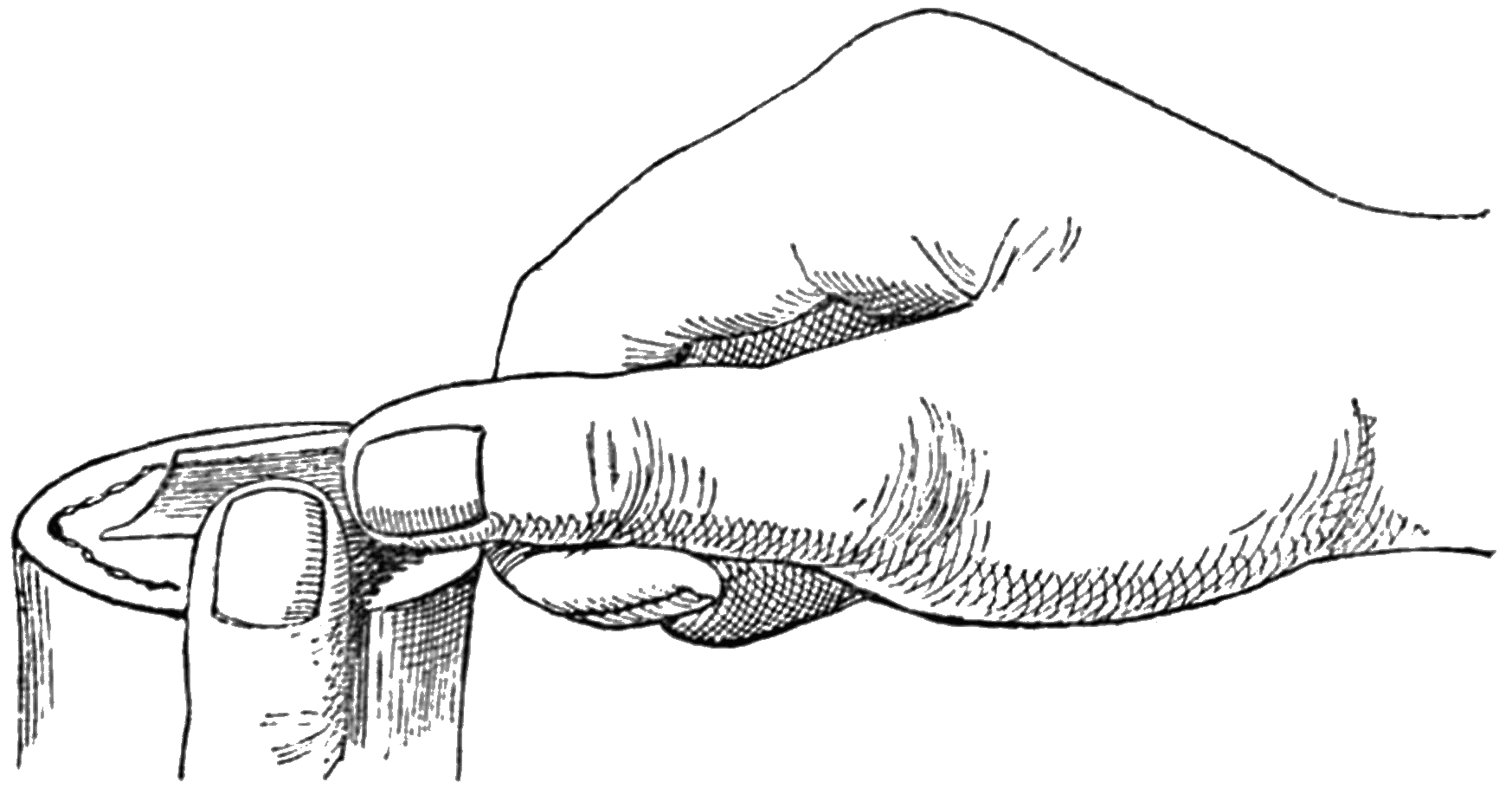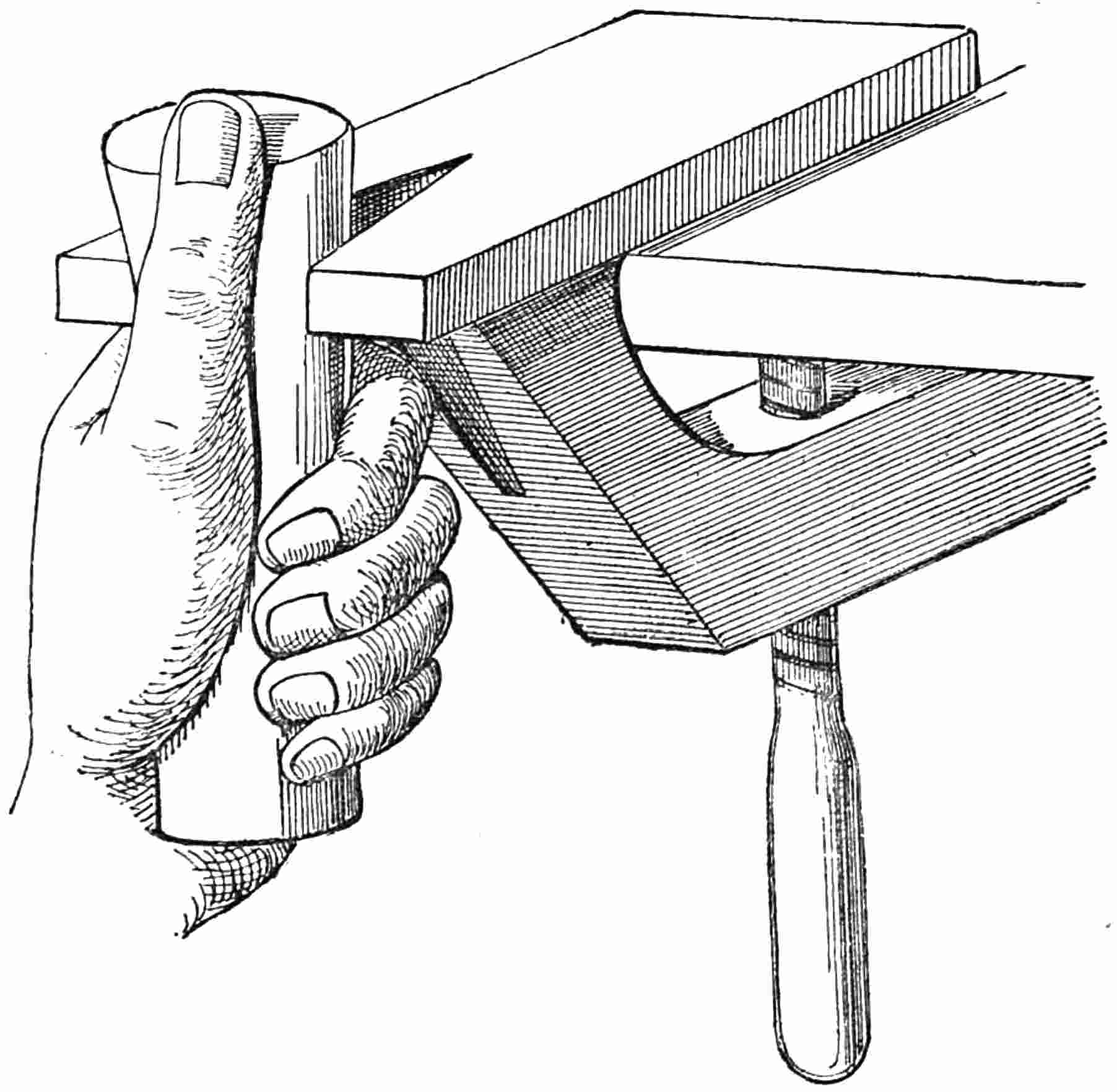 Whatever may be the figure or pattern to be cut, the process is the same with respect to the handling of the tools. The wooden handle lies in the palm of the right hand, and all the power is imparted by the palm. As the material operated upon is almost as hard as marble, power is required to make a cut; but if the tools are well-tempered and very sharp, a little experience will soon teach the cutter how to work. The thumb of the right hand should be protected by a finger-stall from injury by the edge of the tool. In the illustration (Fig. 7) the method of holding the stick is shown in conjunction with the method of holding the tool. The thumb of the left hand rises the height of the nail above the top of the Stick; against this the thumb of the right hand is placed, which furnishes the necessary resistance to the35 power created by the palm of the right hand; the finger and thumb then direct the cut which is to be made by the Scawper.