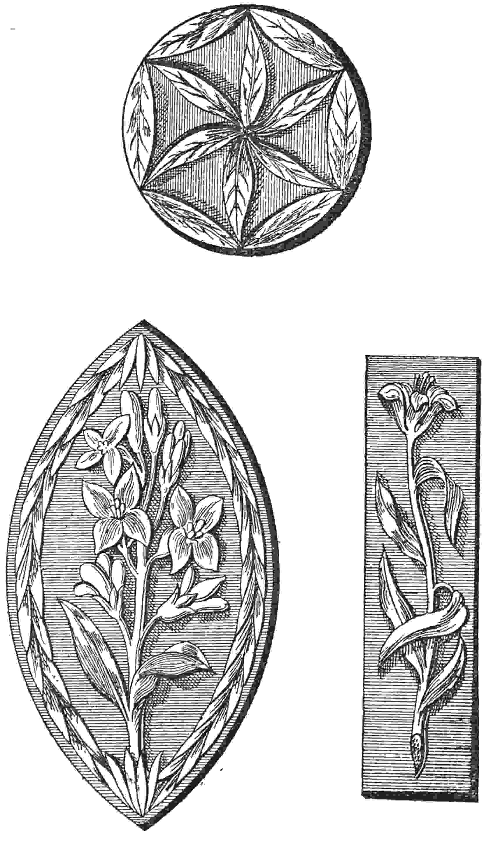 Before attempting any portion of a face, one who is learning should first cut a few simple patterns, such as the following, which would serve as buttons for the mantle which is worn. The40 tools should be used in the order given for the several processes already mentioned.