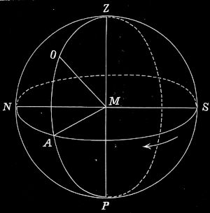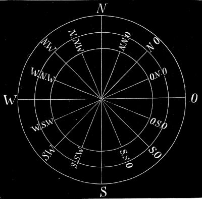 Denken wir uns die gerade Linie zwischen unserem Auge und dem Polarstern auf unsere Horizontebene projiziert, so nennen wir die Richtung dieser Projektion Norden, die entgegengesetzte Richtung – hinter uns – Süden. Ziehen wir von unserem Standpunkte aus in der Horizontebene eine gerade Linie rechtwinklig zur Nordsüdlinie nach links, so heißt die durch diese Linie bezeichnete Richtung Westen, und die Verlängerung jener Linie nach rechts zeigt nach Osten.