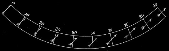 b) Durch die Sonne. Am Tage kann man die Himmelsgegenden mit Hilfe der Sonne feststellen. Beobachten wir sie an verschiedenen Tagen, so zeigt sich, daß sie morgens zwar nicht immer an demselben Punkte, aber doch immer in derselben Gegend, der Ostgegend des Horizontes, am Himmelsgewölbe erscheint,[9] sich an diesem immer höher hebt, bis sie mittags um 12 Uhr den höchsten Punkt ihrer Bahn erreicht hat und dann sinkt, um abends in der Westgegend unter dem Horizonte zu verschwinden. An welcher Stelle des Himmelsgewölbes auch an verschiedenen Tagen mittags der höchste Punkt der Sonnenbahn liegen mag, immer weist die Projektion der geraden Linie zwischen unserem Auge und diesem höchsten Punkte auf die Horizontalebene genau von unserem Standpunkte nach Süden, mit anderen Worten: sie fällt in die Nordsüdlinie, die man deswegen auch Mittagslinie nennt. Da jeder Ort seinen eigenen Horizont und seinen eigenen Zenit hat, hat er auch seine eigene Mittagslinie. Offenbar würde man nach Feststellung dieser Linie alle Himmelsgegenden durch bloße Winkelkonstruktionen bestimmen können. – Aber wie kann man auf einfache Weise die Lage der Mittagslinie eines Ortes bestimmen? Je höher die Sonne steht, desto kürzer ist der Schatten aller Gegenstände, die senkrecht auf der Horizontebene stehen, und umgekehrt. Stellte man also bei Sonnenschein auf eine horizontale Fläche senkrecht einen Stab und beobachtete genau die Länge der Schatten auf der Fläche, so wäre der kürzeste aller Schatten die Mittagslinie. Diese Beobachtung bietet aber praktische Schwierigkeiten und würde sehr unsicher sein; daher ist folgendes Verfahren besser.