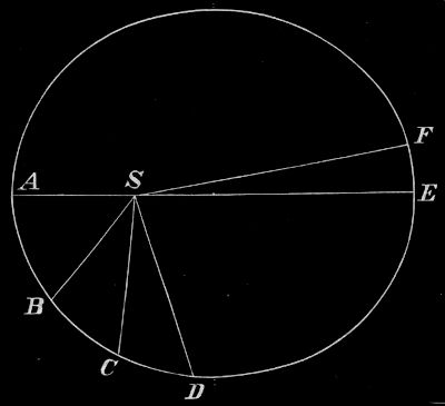 In Fig. 46 bedeutet S = Mittelpunkt der Sonne, Ellipse ABCDEFA = Bahn eines Planeten, SA, SB, SC, SD, SE, SF sind Leitstrahlen nach verschiedenen Stellungen des Planeten. Das zweite Gesetz besagt nun: Durchläuft der Planet den Ellipsenbogen AB in derselben Zeit wie die Bogen BC, CD, EF, so sind die Flächen ABS, BCS, CDS, EFS einander gleich.
