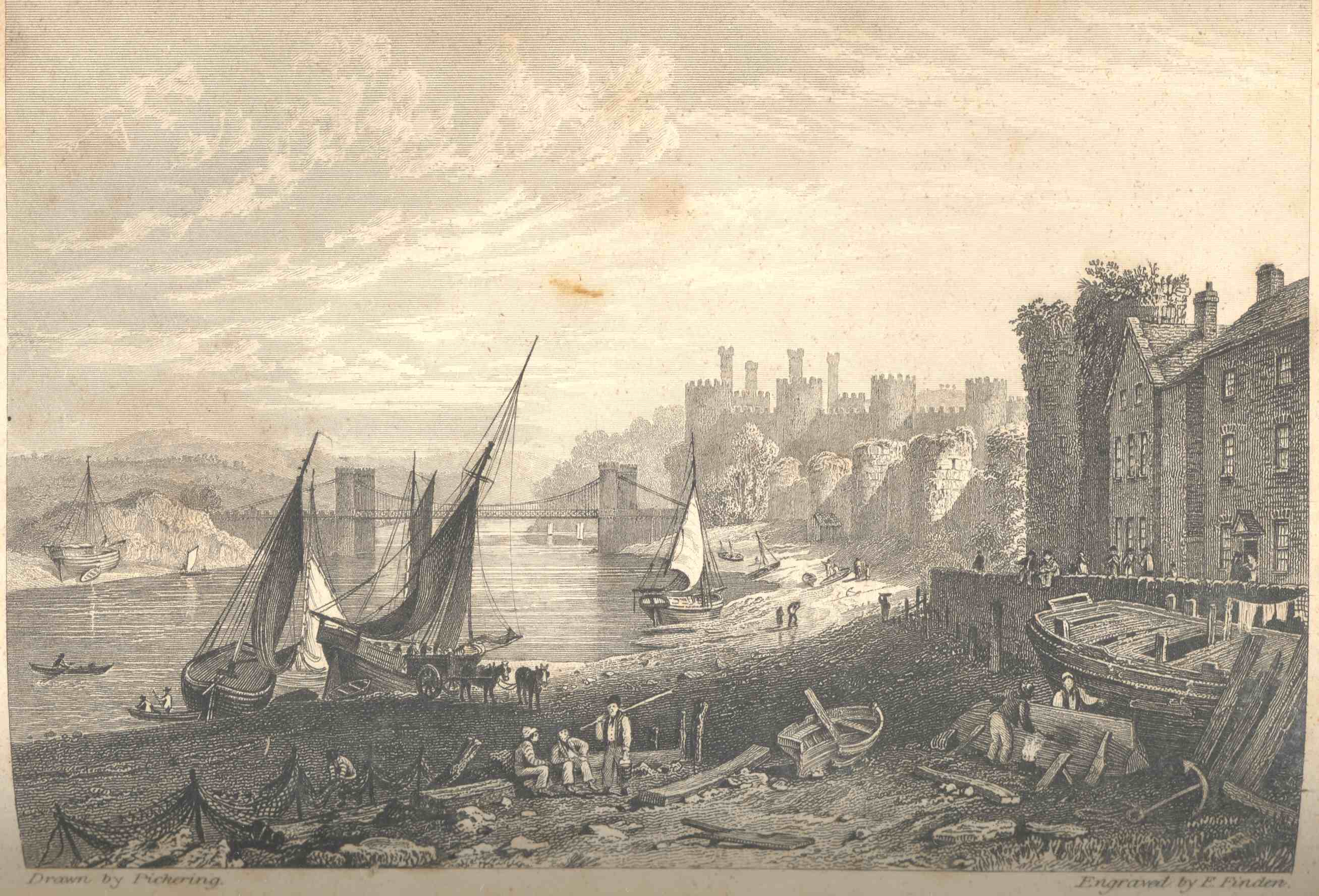 [187] “On the outside of the town walls is a broad and pleasant terrace along the side of the Menai, extending from the quay to the north end of the town walls, and in the evening is a fashionable promenade for persons of all descriptions. From the top of a rock behind the hotel is a fine view of the town and castle: and on a clear day the Isle of Anglesea, Holyhead, and Parys Mountains, may be distinctly seen, like a good map before the eyes.”—Evans.