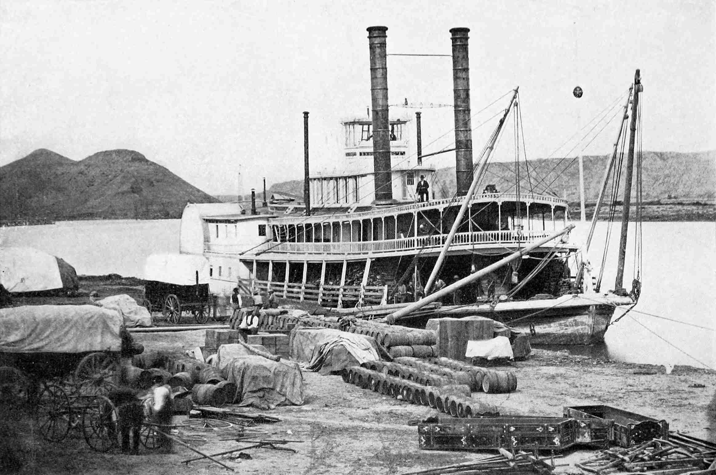 These events bring our sketch of the history of Fort Benton down to the point already reached in our regular narrative. The arrival of the first steamboat in 1859 was an epoch in her history. Followed, as it was, almost immediately by the discovery of gold in Montana, and the consequent rush of emigration, it changed the whole order of things at the post. Stores and other buildings began to appear, and in 1865 a town site was laid off.40 The young city grew with astonishing rapidity and became a place of very great238 importance. Strange indeed must it have seemed to the Indians and to the old trappers to behold upon this spot, where for so many years there had been only a single palisade—sole habitation of white men within five hundred miles—buildings of metropolitan style and quality, trains of wagons coming and going, and lines of noble steamboats lying at the bank along the entire front of the town.41 It was a wonderful metamorphosis, scarcely paralleled in any other city of the country. Mushroom towns have sprung up all over the West, but no permanent city from causes like those which built up Fort Benton. Her rise and greatness were due solely to her position as a strategic point in the commerce of the far Northwest, not from any great mineral discovery in her neighborhood. Her supremacy she maintained until other commercial routes had rendered useless the great natural highway which found its terminus at her door.42