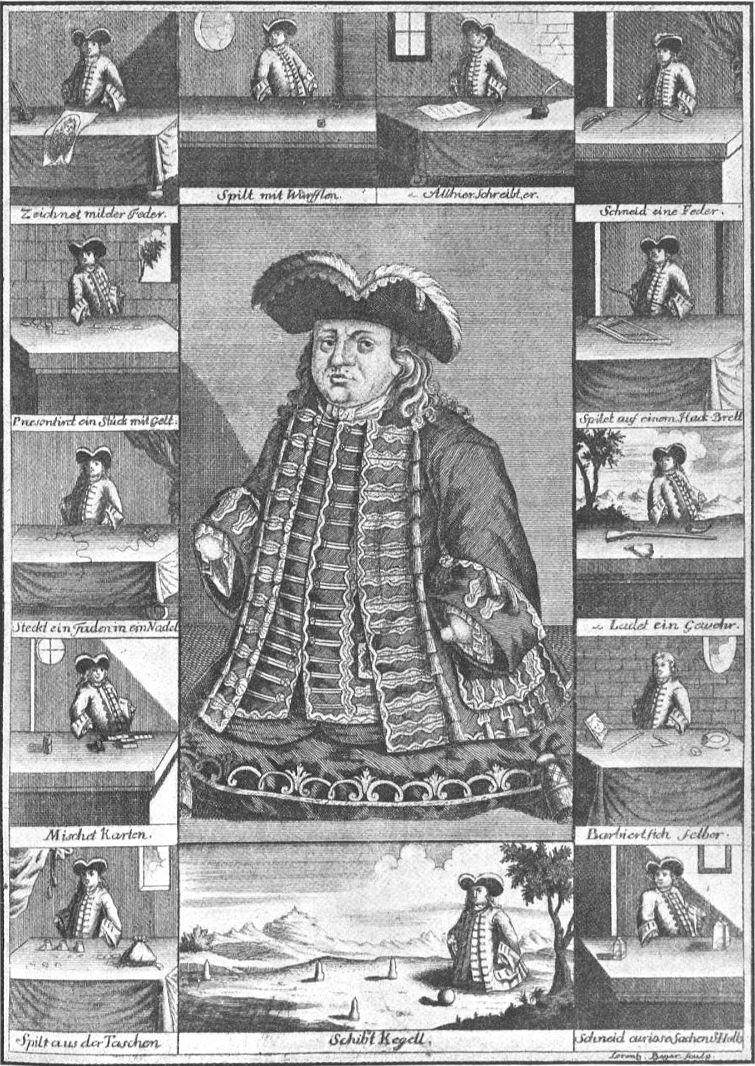 »Mit Bewilligung der Gnädigen und Hochgebietenden Obrigkeit wird bekannt gemacht, dass allhier aus frembden Landen angekommen eine ohne Händ und Füsse gebohrne Person, welche ihre Exercitia vor vielen hohen Potentaten präsentiret hat.