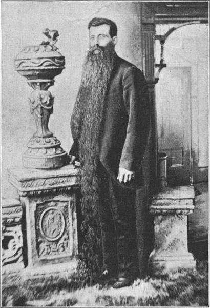 Schon bei seinem ersten öffentlichen Auftreten im Jahre 1886 wurde ihm von den Medicinern ein grosses[S. 79] Interesse entgegengebracht und sie erklärten ihn für einzig in seiner Art dastehend. Eine Menge schneeweisser Haare nämlich wächst wie ein offener Sonnenschirm von sechs Fuss Umfang auf seinem Kopfe. Es ist elastisch, kraus, elektrisch und wächst so üppig, dass es dem Kamms Widerstand leistet und nur mit Bürsten bearbeitet werden kann, und damit es nicht zu lang wird, alle vier bis sechs Wochen gestutzt, um nicht zu sagen geschnitten werden muss.
