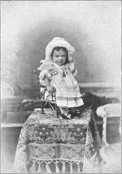 ist gewiss eine kommende »Berühmtheit«. Dieses Kind ist in Hull am 16. April 1895 geboren, war bei der Geburt nur 7 Zoll lang und wog nicht ganz 1 Pfund. Es musste in Watte gewickelt und durch heisse Wasserflaschen warm gehalten werden. Drei Monate lang erhielt es nichts als Zuckerwasser, dann verdünnte Milch, und erst mit 2 Jahren bekam es etwas Fleischbrühe etc. Zur Zeit ist es 4-1/2 Jahre alt, 17 Zoll hoch und wiegt nicht ganz 5 Pfund. Die kleine Mary ist recht gesund, sehr lebhaft und heiter, läuft und spielt wie normale Kinder gleichen Alters, und ist natürlich der Liebling aller Damen. Auch dieses Kind »arbeitet« schon für seinen und der Eltern Lebensunterhalt, denn es wird für Geld gezeigt und macht überall grosse Sensation. Jedenfalls trägt Mary ihre Bezeichnung »die lebende Puppe« mit vollem Rechte.