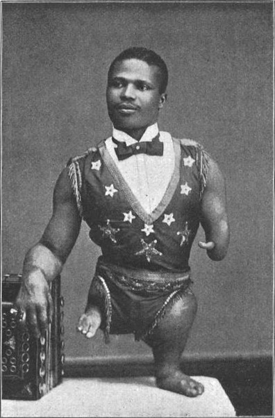 war im Staate Rochester, Nord-Amerika, geboren. Er war bis etwa zum dreissigsten Jahre ein grosser und kräftiger Neger, der für die Michigan Central Railway als Rangirer arbeitete. Im Winter 1876 wurde er Nachts von einem Frachtzuge überfahren und trug schwere Verletzungen davon. Nach mehreren Stunden wurde er aufgefunden und als todt ins Krankenhaus geschafft. Jedoch siegte seine kräftige Natur und er blieb am Leben. Acht Jahre lang konnte er das Bett nicht verlassen, und während dieses Zeitraums war er zum Skelet geworden. Infolge von Gelenk-Rheumatismus war totale Verknöcherung aller Gelenke eingetreten und er hierdurch vollständig bewegungslos geworden.