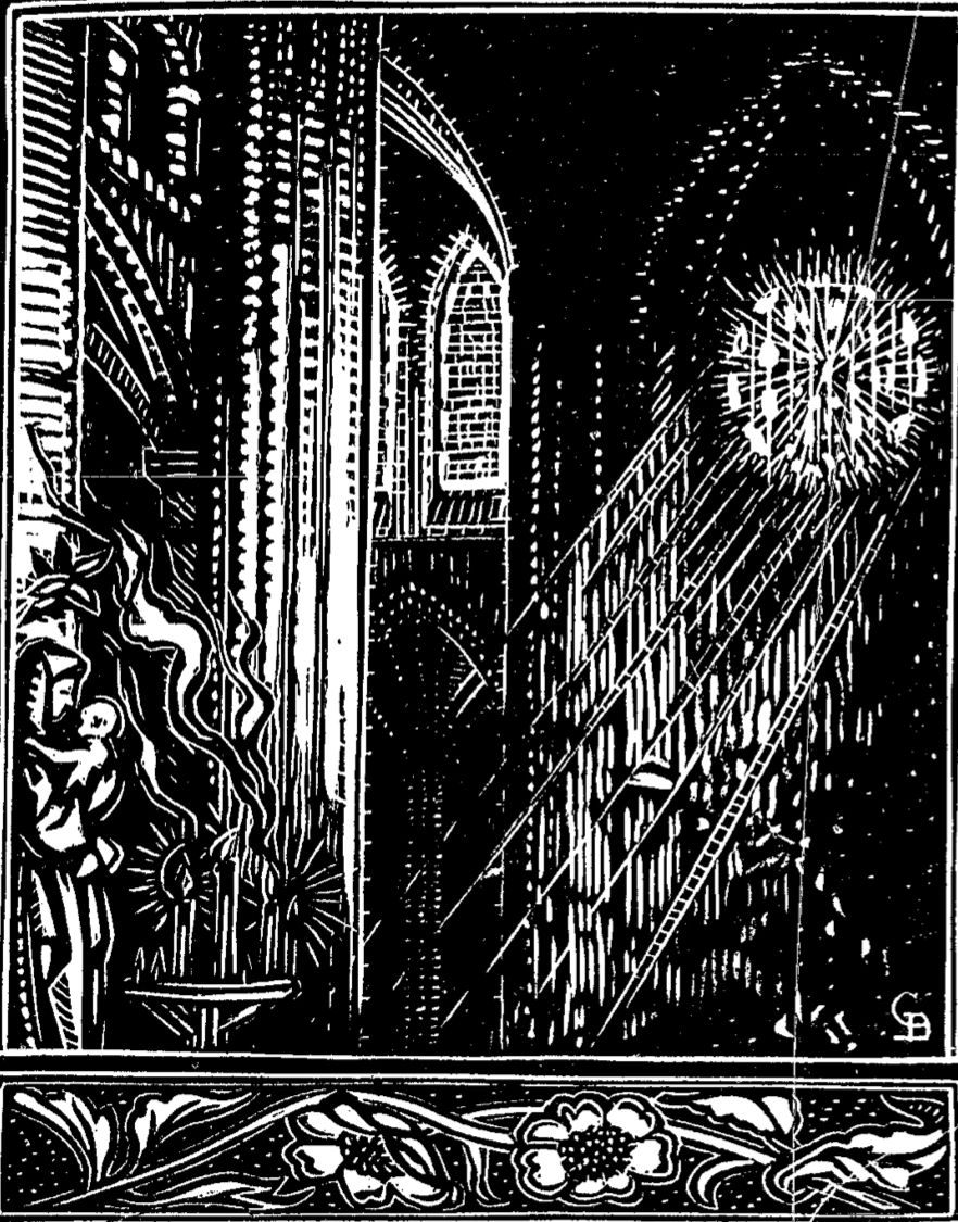 À ce moment, Luce, qui venait de baiser d'un regard passionné son cher petit compagnon,—(les yeux à demi clos et les lèvres entr'ouvertes, il paraissait perdu dans une extase de bonheur, et il levait la tête, par un élan de joie reconnaissante, vers cette Force suprême qu'on cherche instinctivement en haut)—Luce, avec saisissement, vit, dans le vitrail rouge et doré de la chapelle, la figure de l'enfant rousse du parvis qui souriait. Et comme elle restait muette, glacée d'étonnement, elle vit, de nouveau, sur l'étrange visage, la même expression d'effroi et de pitié.