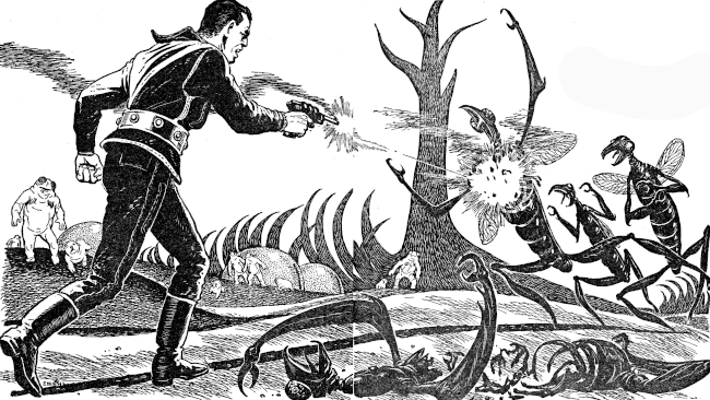 Slipping his field glasses from their case he put them to his eyes. The creature he had seen stood gazing back at him. It was definitely an insect-type, except that it had only four limbs, and stood almost as tall as a man. Its limbs and body were armored and thin, reminding him of the cartoons he had seen of stick-men. Squatting upright on two large legs it stood motionless, holding its smaller upper limbs bent clawlike at its sides. Sunlight glinted from two eye-lens clusters on each side of its thin sharp head. It resembled a giant praying-mantis.