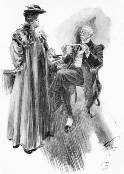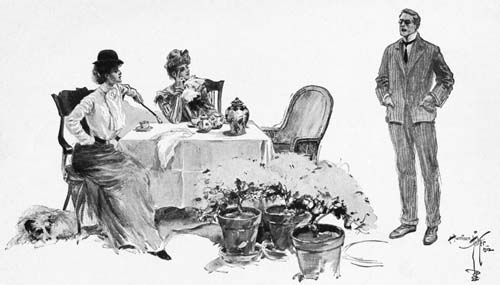 It was five o’clock in a late September afternoon. As usual, on the low table on the porch viewing the Italian garden at Beauvais Hall was the big tea tray with its array of antique silver and old porcelain, the cake and the toast and the slices of bread and butter.[327] Round it were Evelyn and Gwen and Frothingham—Gwen in a shirtwaist and riding skirt, Frothingham in the slovenly, baggy flannels of an English gentleman in the seclusion of his country-seat. No one was speaking and the quiet was profound. Presently Evelyn rose and went through the open French window into the drawing room. Gwen was watching Frothingham; he was watching the peacocks as they strutted with tails spread in splendour.