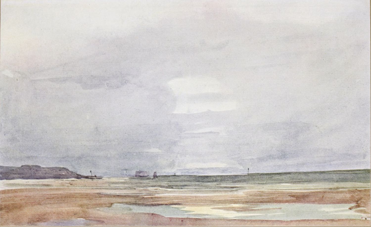 All the coloured reproductions in the present volume represent drawings made during the artist’s residence in Hereford. The Chepstow Bridge and Castle (Plate XII.) was probably one of the results of Cox’s first sketching tour after his removal, and this very drawing may possibly have formed one of the exhibits which he sent to the Society of Painters in Water-Colour in 1816. Plate XXIII. may represent the sketch made for the picture of Goodrich Castle on the Wye, which the artist exhibited in 1819. In both the drawings, as in the unfinished Frontispiece, the colour scheme is less severe than in the earlier Westminster. They are less like Girtin’s than like early Cotmans; and though they lack something of Cotman’s fastidiousness of selection, and the aristocratic charm of his draughtsmanship and design, they have a sobriety, reserve and seriousness of their own which must make them objects of delight to their fortunate possessor. The slightness of the execution of Low Tide (Plate XXXIV.) is no hindrance to the poignant expression of its sentiment. Unfortunately, it has not been found convenient to reproduce the magnificent—albeit unfinished—water-colour, entitled Autumn Woods, in its original colours. The half-tone reproduction (Plate XIX.), however, is useful as a suggestion of the simple dignity that reigns in this beautiful drawing—assuredly one of the finest works produced during the artist’s residence in Hereford.