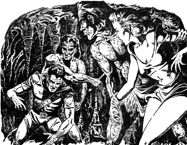 But he never spoke. A great hard-palmed hand clamped across his lips and an arm crushed his ribs together. Dimly he could see a savage face and the naked body of his assailant. There were other shadowy shapes, too. He felt Relsa Dav's fingers torn from his grasp. His knotted fists slammed into the hard flesh of the savage.