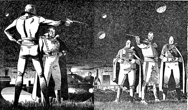 Something less than ten minutes passed before a ground car skidded to a stop near the wrecked ship. Two Trygonian soldiers jumped out with hand-blasters at the ready. More sedately, as befitted his rank, a Senior Lieutenant followed and Savage walked briskly to meet him. The Lieutenant eyed Savage dubiously for a brief moment and then snapped to the salute.