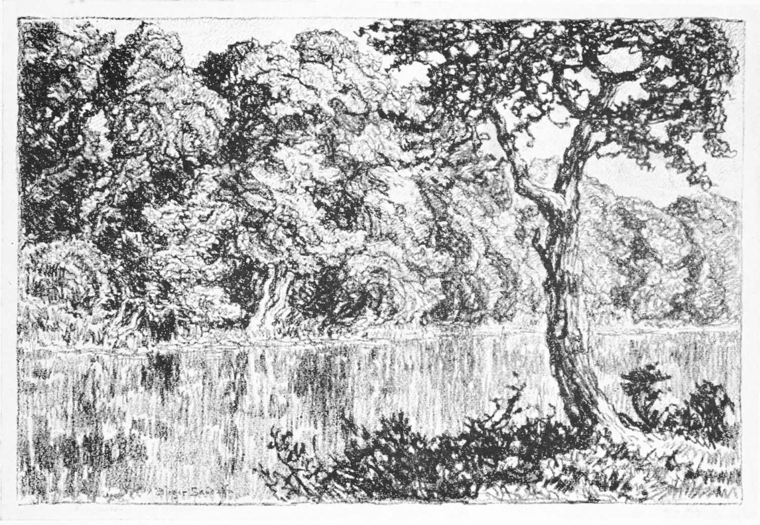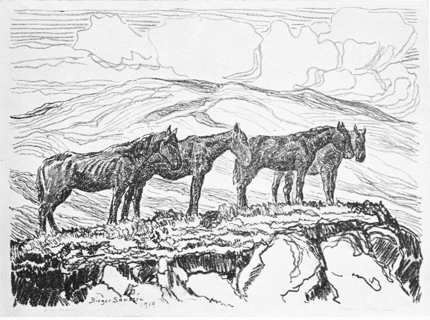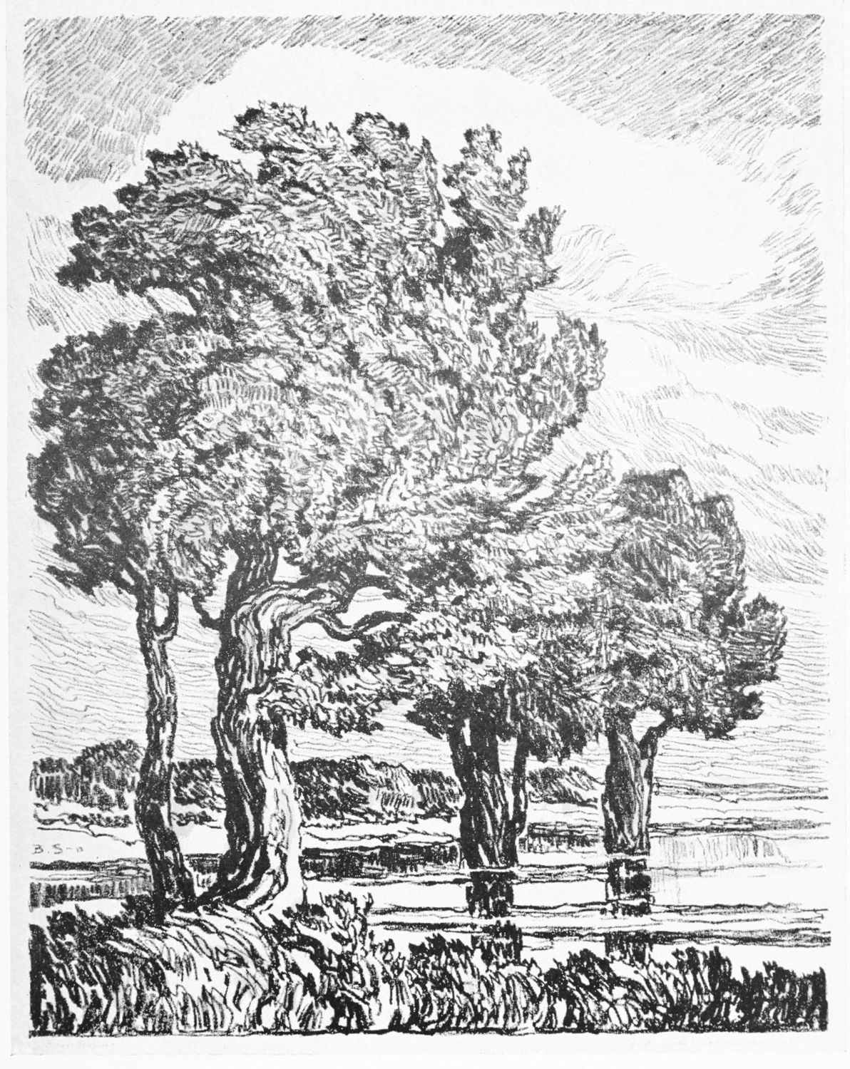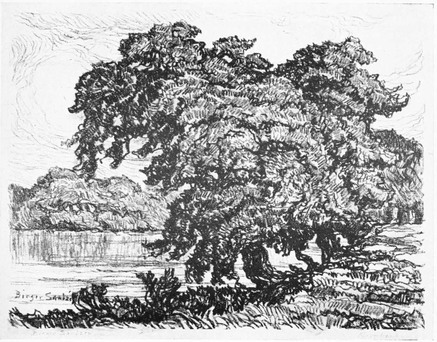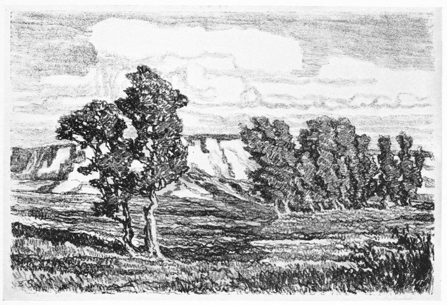 It was so that Birger Sandzen learned to love the Kansas landscape. But first he sought the shadowed banks of the Smoky. By sunlight and moonlight he studied it. Following its graceful windings, he caught the poetry of Kansas,—the tired droop of cattle as they came to drink at dusk, the grouping of horses in hillside pastures, huddled cottonwoods like shy children along the clean banks of the stream.