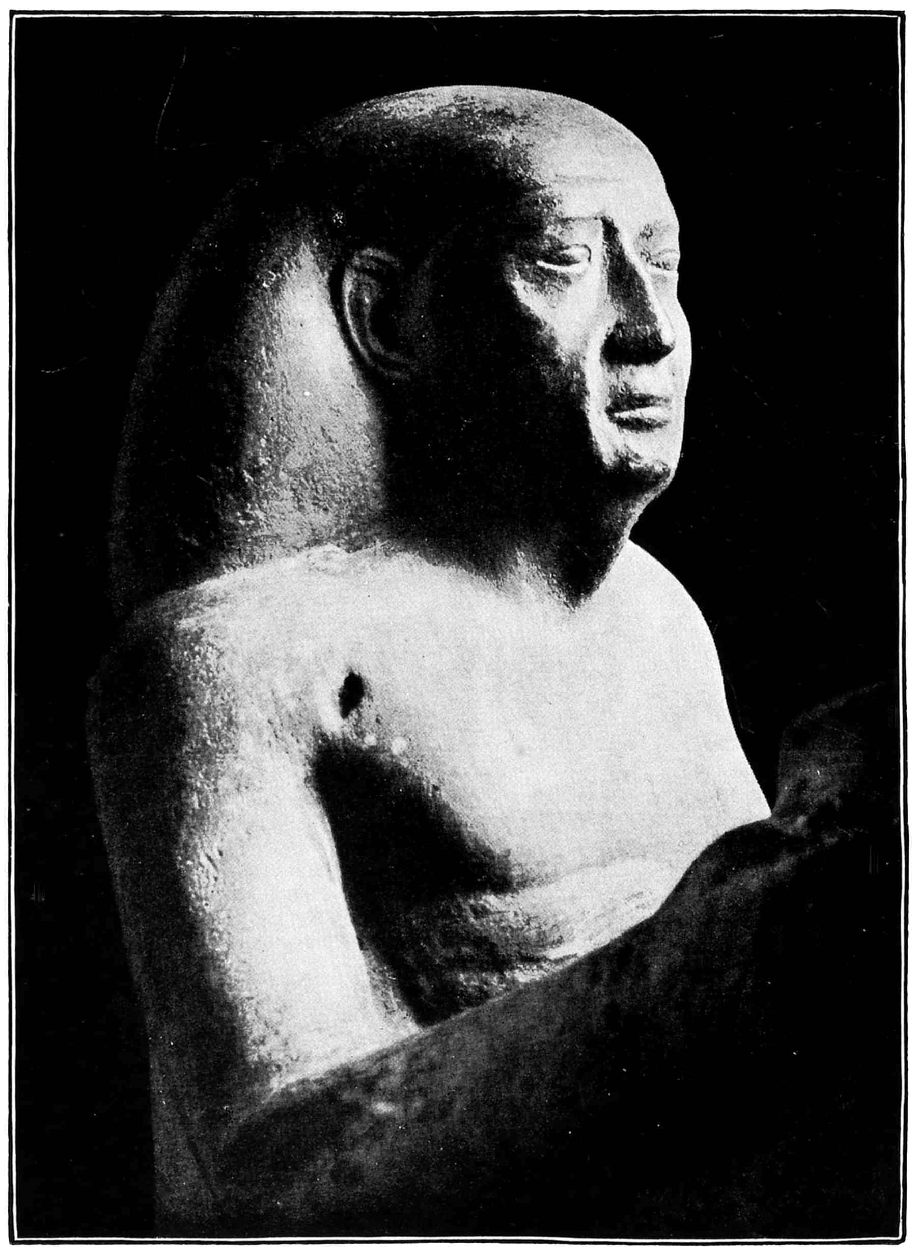 37 Mariette, “Notice des principaux monuments du Musée de Boulaq,” 6th edition, 1876, p. 235, No. 769: “Memphis. Saqqarah—limestone II, 1 foot 2 inches—kneeling figure. His hands crossed on his legs. His eyes are of mosaic work and formed of several stones curiously combined.” The statue of the kneeling scribe figures in a group in Plate XX of Mariette’s work, “Album du Musée de Boulaq,” containing 40 plates, photographed by MM. Délié and Béchard, with explanatory text edited by Auguste Mariette-Bey. Cairo, Mourès et Cie, 1871, fol.